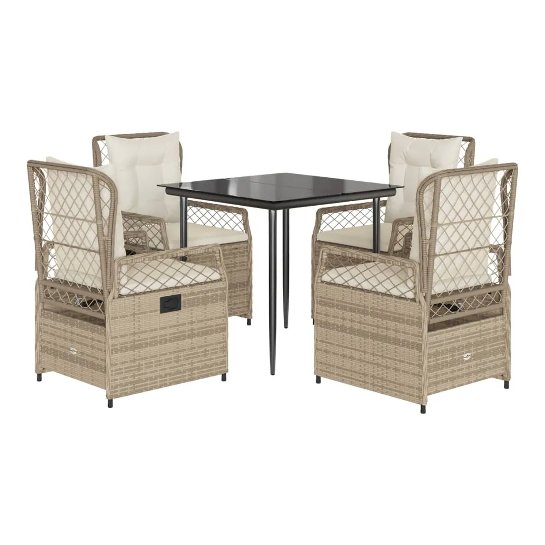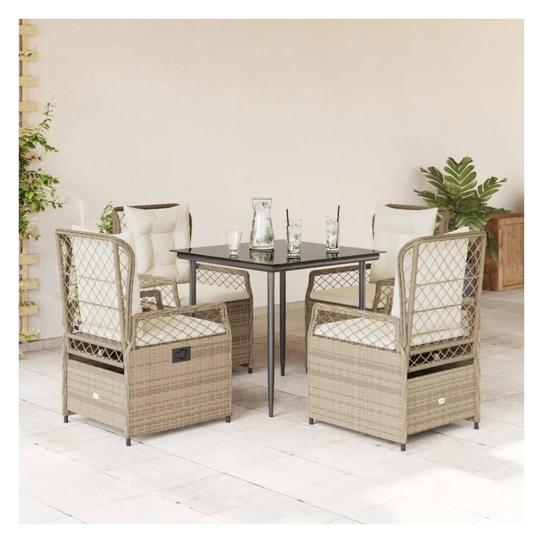 Cet ensemble de salle à manger de jardin est un excellent choix pour les repas en plein air ou pour vous détendre dans le jardin, dans l'arrière-cour ou sur la terrasse. Matériau durable : la résine tressée, également connue sous le nom de poly rotin, est un matériau synthétique solide et nécessitant peu d'entretien qui ressemble au rotin naturel. Il est léger, facile à nettoyer et couramment utilisé pour les meubles d'extérieur en raison de sa durabilité et de ses propriétés de résistance aux intempéries.Dossier réglable : ce siège de jardin est doté d'une poignée. Vous pouvez régler le dossier dans n'importe quelle position en tirant sur la poignée et le remettre rapidement dans sa position initiale.Expérience d'assise confortable : ce mobilier d'extérieur, doté de coussins épais, offre une expérience d'assise confortable.Housse amovible et lavable : le coussin de siège est doté d'une housse amovible pour un lavage et un entretien faciles.Dessus en verre : le dessus de la table d'extérieur est fabriqué en verre trempé solide et durable, ce qui le rend facile à nettoyer avec un chiffon humide et ajoute une touche d'élégance à votre espace extérieur. Bon à savoir :Pour que vos meubles d'extérieur restent beaux, nous vous recommandons de les protéger avec une housse imperméable.