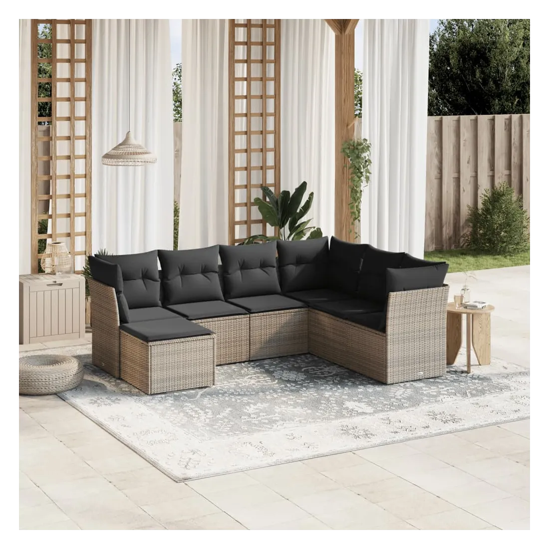 Cet ensemble de canapés de jardin est le complément parfait de votre arrière-cour, terrasse ou patio, offrant un espace confortable et accueillant pour discuter avec la famille et les amis ou simplement se détendre et profiter de l'extérieur. Matériau durable : la résine tressée, également connue sous le nom de poly rotin, est un matériau synthétique solide et nécessitant peu d'entretien qui ressemble au rotin naturel. Il est léger, facile à nettoyer et couramment utilisé pour les meubles d'extérieur en raison de sa durabilité et de ses propriétés de résistance aux intempéries.Expérience d'assise confortable : ce mobilier d'extérieur, doté de coussins épais, offre une expérience d'assise confortable.Housse amovible et lavable : ces coussins de siège sont dotés de housses amovibles pour un lavage et un entretien faciles.Cadre robuste et stable : le cadre en acier enduit de poudre assure la solidité et la stabilité du meuble de jardin pour une utilisation quotidienne à l'extérieur.Conception modulaire : cet ensemble de meubles d'extérieur a une conception modulaire, ce qui le rend complètement flexible et facile à déplacer, afin que vous puissiez créer un agencement de meubles d'extérieur personnalisé. Bon à savoir :Pour que vos meubles d'extérieur restent beaux, nous vous recommandons de les protéger avec une housse imperméable.