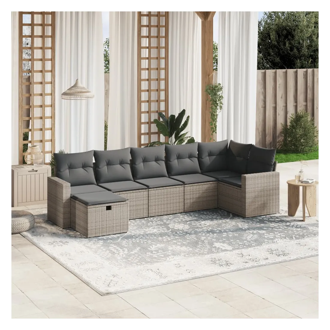 Cet ensemble de canapés de jardin est le complément parfait de votre arrière-cour, terrasse ou patio, offrant un espace confortable et accueillant pour discuter avec la famille et les amis ou simplement se détendre et profiter de l'extérieur. Matériau durable : la résine tressée, également connue sous le nom de poly rotin, est un matériau synthétique solide et nécessitant peu d'entretien qui ressemble au rotin naturel. Il est léger, facile à nettoyer et couramment utilisé pour les meubles d'extérieur en raison de sa durabilité et de ses propriétés de résistance aux intempéries.Expérience d'assise confortable : ce mobilier d'extérieur, doté de coussins épais, offre une expérience d'assise confortable.Housse amovible et lavable : ces coussins de siège sont dotés de housses amovibles pour un lavage et un entretien faciles.Cadre robuste et stable : le cadre en acier enduit de poudre assure la solidité et la stabilité du meuble de jardin pour une utilisation quotidienne à l'extérieur.Conception modulaire : cet ensemble de meubles d'extérieur a une conception modulaire, ce qui le rend complètement flexible et facile à déplacer, afin que vous puissiez créer un agencement de meubles d'extérieur personnalisé. Bon à savoir :Pour que vos meubles d'extérieur restent beaux, nous vous recommandons de les protéger avec une housse imperméable.