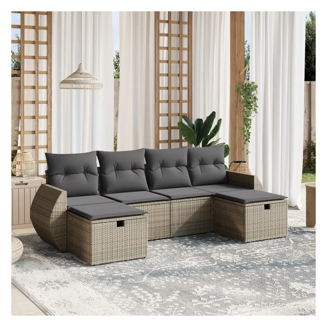Cet ensemble de canapés de jardin est le complément parfait de votre arrière-cour, terrasse ou patio, offrant un espace confortable et accueillant pour discuter avec la famille et les amis ou simplement se détendre et profiter de l'extérieur. Matériau durable : la résine tressée, également connue sous le nom de poly rotin, est un matériau synthétique solide et nécessitant peu d'entretien qui ressemble au rotin naturel. Il est léger, facile à nettoyer et couramment utilisé pour les meubles d'extérieur en raison de sa durabilité et de ses propriétés de résistance aux intempéries.Expérience d'assise confortable : ce mobilier d'extérieur, doté de coussins épais, offre une expérience d'assise confortable.Housse amovible et lavable : ces coussins de siège sont dotés de housses amovibles pour un lavage et un entretien faciles.Cadre robuste et stable : le cadre en acier enduit de poudre assure la solidité et la stabilité du meuble de jardin pour une utilisation quotidienne à l'extérieur.Conception modulaire : cet ensemble de meubles d'extérieur a une conception modulaire, ce qui le rend complètement flexible et facile à déplacer, afin que vous puissiez créer un agencement de meubles d'extérieur personnalisé. Bon à savoir :Pour que vos meubles d'extérieur restent beaux, nous vous recommandons de les protéger avec une housse imperméable.