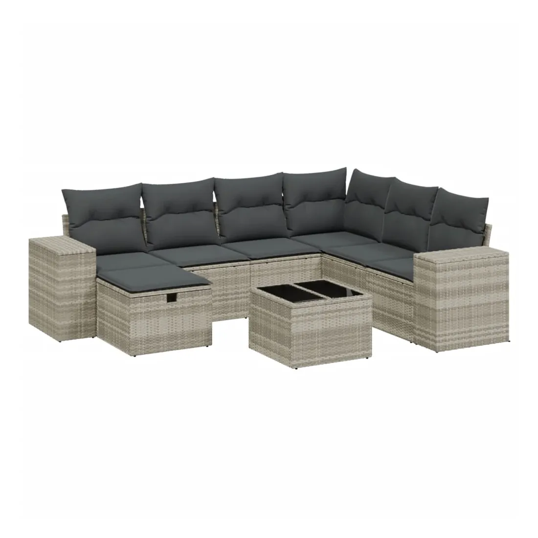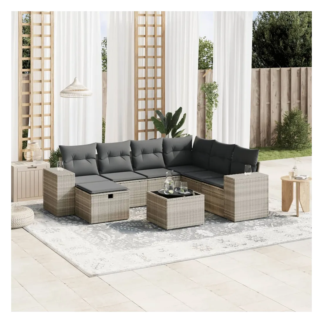 Cet ensemble de canapés de jardin est le complément parfait de votre arrière-cour, terrasse ou patio, offrant un espace confortable et accueillant pour discuter avec la famille et les amis ou simplement se détendre et profiter de l'extérieur. Matériau durable : la résine tressée, également connue sous le nom de poly rotin, est un matériau synthétique solide et nécessitant peu d'entretien qui ressemble au rotin naturel. Il est léger, facile à nettoyer et couramment utilisé pour les meubles d'extérieur en raison de sa durabilité et de ses propriétés de résistance aux intempéries.Dessus en verre : le dessus de la table d'extérieur est fabriqué en verre trempé solide et durable, ce qui le rend facile à nettoyer avec un chiffon humide et ajoute une touche d'élégance à votre espace extérieur.Housse amovible et lavable : ces coussins de siège sont dotés de housses amovibles pour un lavage et un entretien faciles.Cadre robuste et stable : le cadre en acier enduit de poudre assure la solidité et la stabilité du meuble de jardin pour une utilisation quotidienne à l'extérieur.Conception modulaire : cet ensemble de meubles d'extérieur a une conception modulaire, ce qui le rend complètement flexible et facile à déplacer, afin que vous puissiez créer un agencement de meubles d'extérieur personnalisé. Bon à savoir :Pour que vos meubles d'extérieur restent beaux, nous vous recommandons de les protéger avec une housse imperméable.
