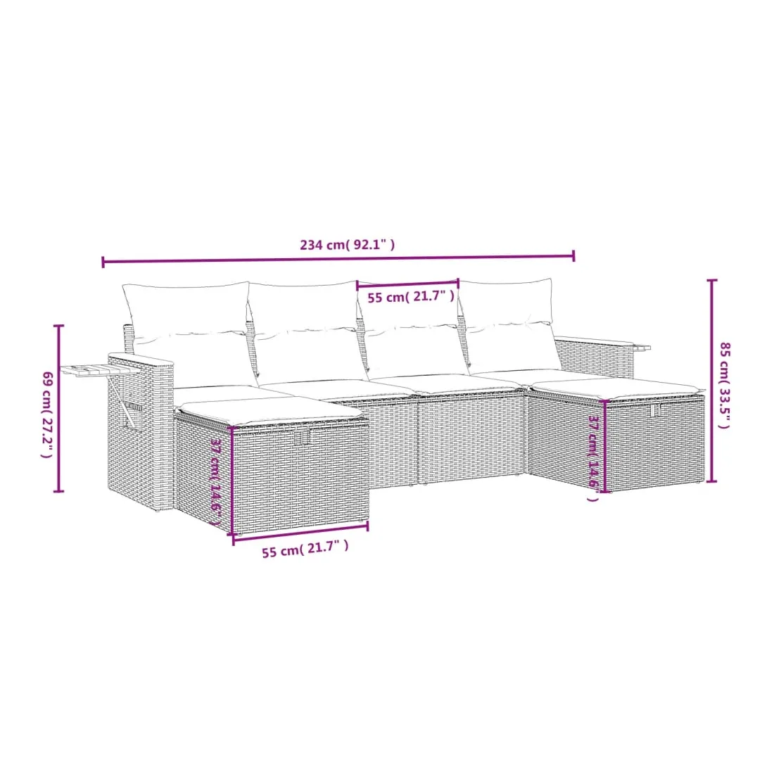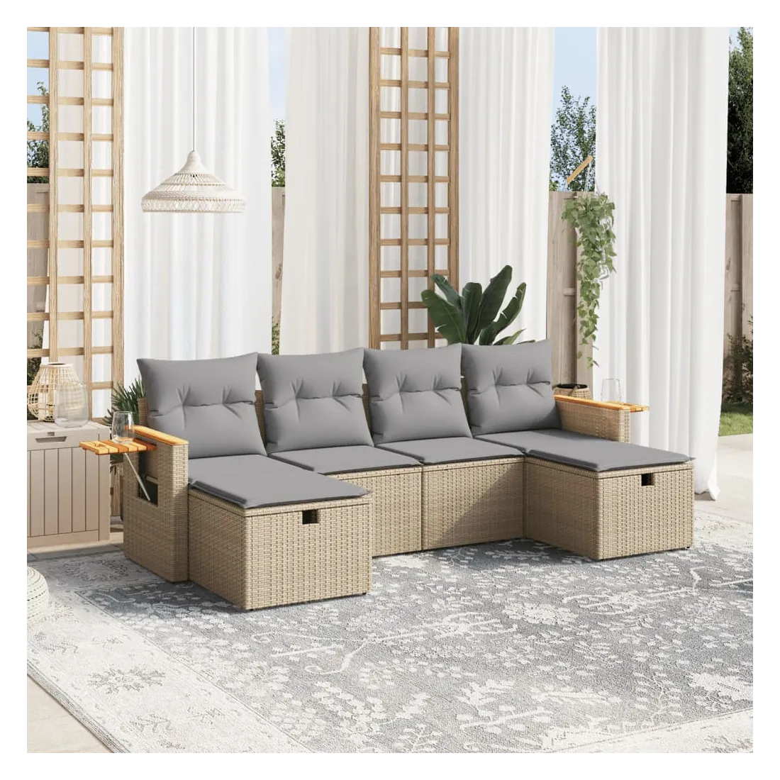 Cet ensemble de canapés de jardin est le complément parfait de votre arrière-cour, terrasse ou patio, offrant un espace confortable et accueillant pour discuter avec la famille et les amis ou simplement se détendre et profiter de l'extérieur. Matériau durable : la résine tressée, également connue sous le nom de poly rotin, est un matériau synthétique solide et nécessitant peu d'entretien qui ressemble au rotin naturel. Il est léger, facile à nettoyer et couramment utilisé pour les meubles d'extérieur en raison de sa durabilité et de ses propriétés de résistance aux intempéries.Expérience d'assise confortable : ce mobilier d'extérieur, doté de coussins épais, offre une expérience d'assise confortable.Housse amovible et lavable : ces coussins de siège sont dotés de housses amovibles pour un lavage et un entretien faciles.Cadre robuste et stable : le cadre en acier enduit de poudre assure la solidité et la stabilité du meuble de jardin pour une utilisation quotidienne à l'extérieur.Conception modulaire : cet ensemble de meubles d'extérieur a une conception modulaire, ce qui le rend complètement flexible et facile à déplacer, afin que vous puissiez créer un agencement de meubles d'extérieur personnalisé. Bon à savoir :Pour que vos meubles d'extérieur restent beaux, nous vous recommandons de les protéger avec une housse imperméable.