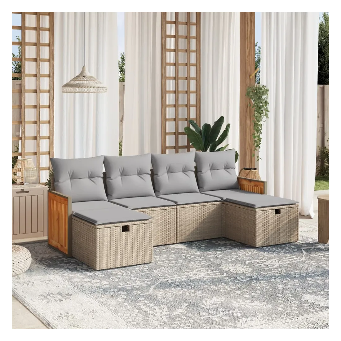 Cet ensemble de canapés de jardin est le complément parfait de votre arrière-cour, terrasse ou patio, offrant un espace confortable et accueillant pour discuter avec la famille et les amis ou simplement se détendre et profiter de l'extérieur. Matériau durable : la résine tressée, également connue sous le nom de poly rotin, est un matériau synthétique solide et nécessitant peu d'entretien qui ressemble au rotin naturel. Il est léger, facile à nettoyer et couramment utilisé pour les meubles d'extérieur en raison de sa durabilité et de ses propriétés de résistance aux intempéries.Expérience d'assise confortable : ce mobilier d'extérieur, doté de coussins épais, offre une expérience d'assise confortable.Housse amovible et lavable : ces coussins de siège sont dotés de housses amovibles pour un lavage et un entretien faciles.Cadre robuste et stable : le cadre en acier enduit de poudre assure la solidité et la stabilité du meuble de jardin pour une utilisation quotidienne à l'extérieur.Conception modulaire : cet ensemble de meubles d'extérieur a une conception modulaire, ce qui le rend complètement flexible et facile à déplacer, afin que vous puissiez créer un agencement de meubles d'extérieur personnalisé. Bon à savoir :Pour que vos meubles d'extérieur restent beaux, nous vous recommandons de les protéger avec une housse imperméable.