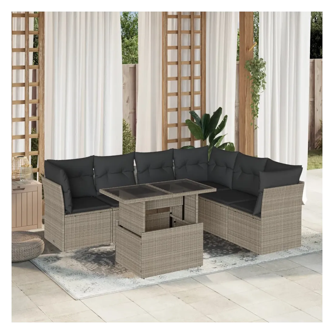 Cet ensemble de canapés de jardin est le complément parfait de votre arrière-cour, terrasse ou patio, offrant un espace confortable et accueillant pour discuter avec la famille et les amis ou simplement se détendre et profiter de l'extérieur. Matériau durable : la résine tressée, également connue sous le nom de poly rotin, est un matériau synthétique solide et nécessitant peu d'entretien qui ressemble au rotin naturel. Elle est légère, facile à nettoyer et couramment utilisée pour les meubles d'extérieur en raison de sa durabilité et de ses propriétés de résistance aux intempéries.Dessus de table réglable : le dessus de table peut être soulevé pour rendre la table plus haute, ce qui transforme la table d'extérieur d'une table basse à une table de salle à manger. Elle est parfaite pour recevoir des invités ou prendre des repas à l'extérieur.Expérience d'assise confortable : ce mobilier d'extérieur, doté de coussins épais, offre une expérience d'assise confortable.Housse amovible et lavable : ces coussins de siège sont dotés de housses amovibles pour un lavage et un entretien faciles.Conception modulaire : cet ensemble de meubles d'extérieur a une conception modulaire, ce qui le rend complètement flexible et facile à déplacer, afin que vous puissiez créer un agencement de meubles d'extérieur personnalisé. Bon à savoir :Pour que vos meubles d'extérieur restent beaux, nous vous recommandons de les protéger avec une housse imperméable.