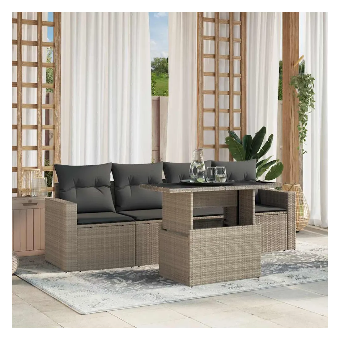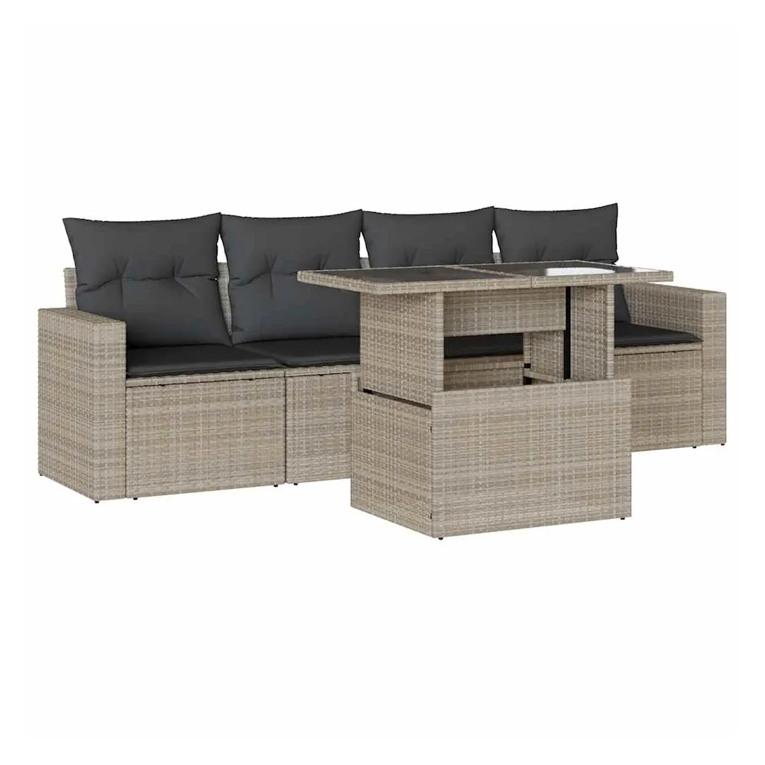 Cet ensemble de canapés de jardin est le complément parfait de votre arrière-cour, terrasse ou patio, offrant un espace confortable et accueillant pour discuter avec la famille et les amis ou simplement se détendre et profiter de l'extérieur. Matériau durable : la résine tressée, également connue sous le nom de poly rotin, est un matériau synthétique solide et nécessitant peu d'entretien qui ressemble au rotin naturel. Elle est légère, facile à nettoyer et couramment utilisée pour les meubles d'extérieur en raison de sa durabilité et de ses propriétés de résistance aux intempéries.Dessus de table réglable : le dessus de table peut être soulevé pour rendre la table plus haute, ce qui transforme la table d'extérieur d'une table basse à une table de salle à manger. Elle est parfaite pour recevoir des invités ou prendre des repas à l'extérieur.Expérience d'assise confortable : ce mobilier d'extérieur, doté de coussins épais, offre une expérience d'assise confortable.Housse amovible et lavable : ces coussins de siège sont dotés de housses amovibles pour un lavage et un entretien faciles.Conception modulaire : cet ensemble de meubles d'extérieur a une conception modulaire, ce qui le rend complètement flexible et facile à déplacer, afin que vous puissiez créer un agencement de meubles d'extérieur personnalisé. Bon à savoir :Pour que vos meubles d'extérieur restent beaux, nous vous recommandons de les protéger avec une housse imperméable.
