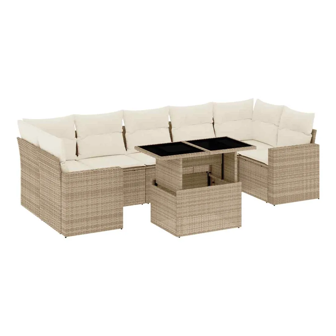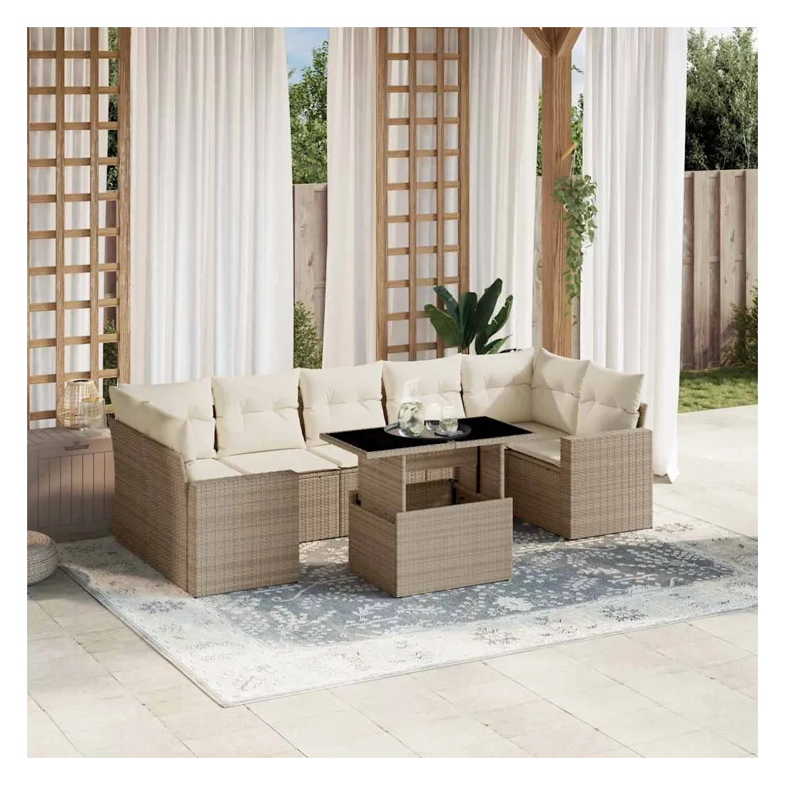 Cet ensemble de canapés de jardin est le complément parfait de votre arrière-cour, terrasse ou patio, offrant un espace confortable et accueillant pour discuter avec la famille et les amis ou simplement se détendre et profiter de l'extérieur. Matériau durable : la résine tressée, également connue sous le nom de poly rotin, est un matériau synthétique solide et nécessitant peu d'entretien qui ressemble au rotin naturel. Il est léger, facile à nettoyer et couramment utilisé pour les meubles d'extérieur en raison de sa durabilité et de ses propriétés de résistance aux intempéries.Dessus de table réglable : le dessus de table peut être soulevé pour rendre la table plus haute, ce qui transforme la table d'extérieur d'une table basse à une table de salle à manger. Elle est parfaite pour recevoir des invités ou prendre des repas à l'extérieur.Expérience d'assise confortable : ce mobilier d'extérieur, doté de coussins épais, offre une expérience d'assise confortable.Housse amovible et lavable : ces coussins de siège sont dotés de housses amovibles pour un lavage et un entretien faciles.Conception modulaire : cet ensemble de meubles d'extérieur a une conception modulaire, ce qui le rend complètement flexible et facile à déplacer, afin que vous puissiez créer un agencement de meubles d'extérieur personnalisé. Bon à savoir :Pour que vos meubles d'extérieur restent beaux, nous vous recommandons de les protéger avec une housse imperméable.