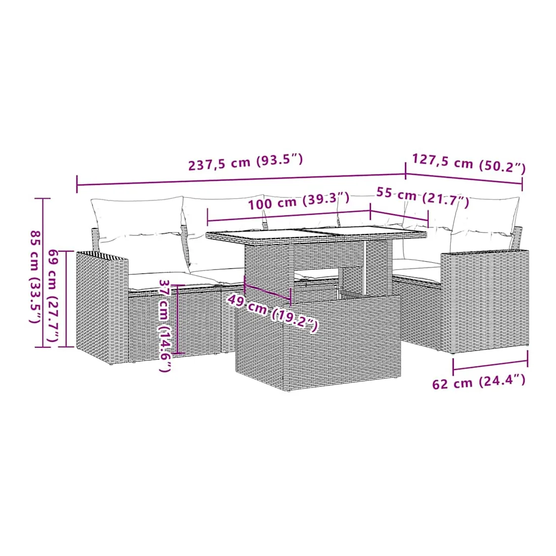 Cet ensemble de canapés de jardin est le complément parfait de votre arrière-cour, terrasse ou patio, offrant un espace confortable et accueillant pour discuter avec la famille et les amis ou simplement se détendre et profiter de l'extérieur. Matériau durable : la résine tressée, également connue sous le nom de poly rotin, est un matériau synthétique solide et nécessitant peu d'entretien qui ressemble au rotin naturel. Il est léger, facile à nettoyer et couramment utilisé pour les meubles d'extérieur en raison de sa durabilité et de ses propriétés de résistance aux intempéries.Dessus de table réglable : le dessus de table peut être soulevé pour rendre la table plus haute, ce qui transforme la table d'extérieur d'une table basse à une table de salle à manger. Elle est parfaite pour recevoir des invités ou prendre des repas à l'extérieur.Expérience d'assise confortable : ce mobilier d'extérieur, doté de coussins épais, offre une expérience d'assise confortable.Housse amovible et lavable : ces coussins de siège sont dotés de housses amovibles pour un lavage et un entretien faciles.Conception modulaire : cet ensemble de meubles d'extérieur a une conception modulaire, ce qui le rend complètement flexible et facile à déplacer, afin que vous puissiez créer un agencement de meubles d'extérieur personnalisé. Bon à savoir :Pour que vos meubles d'extérieur restent beaux, nous vous recommandons de les protéger avec une housse imperméable.
