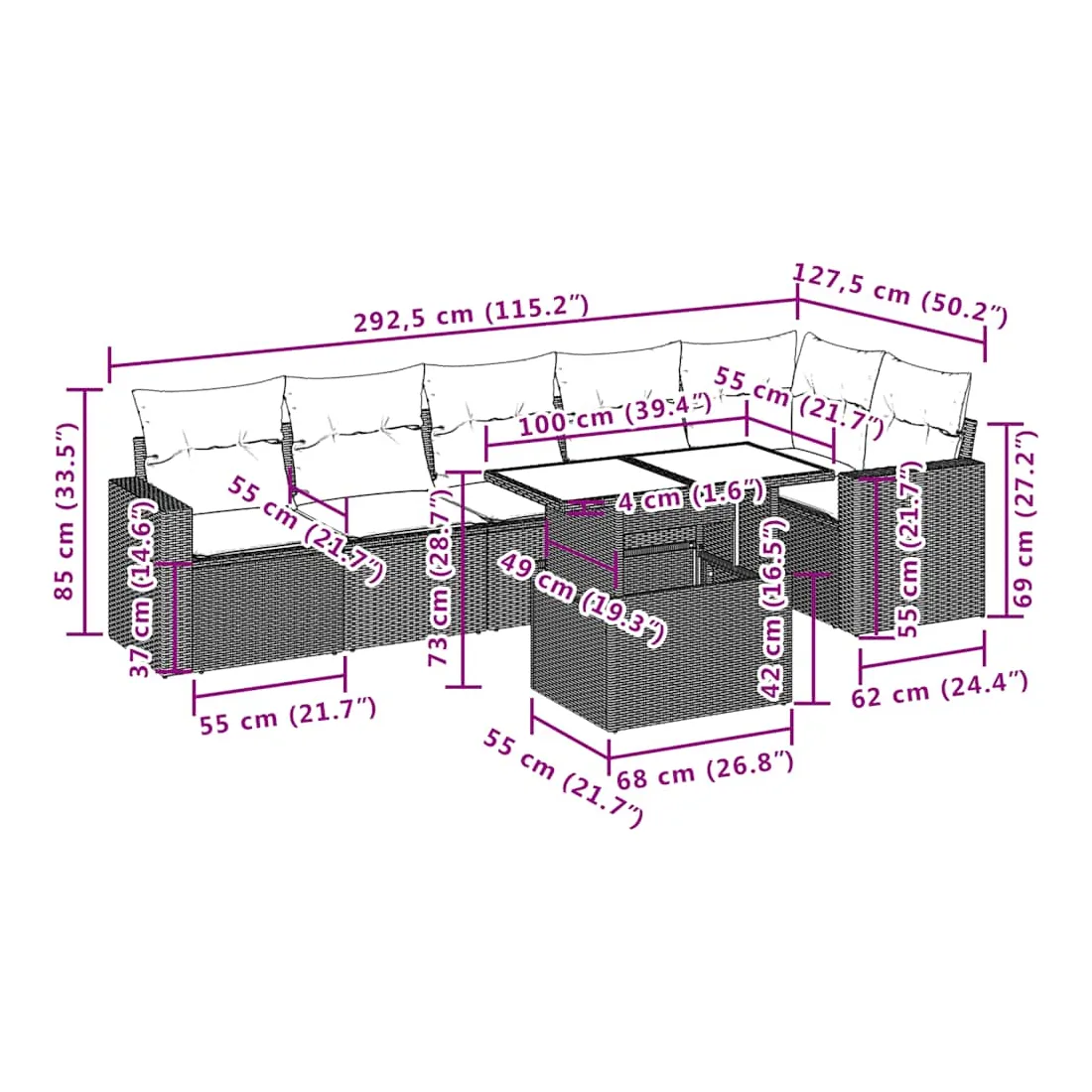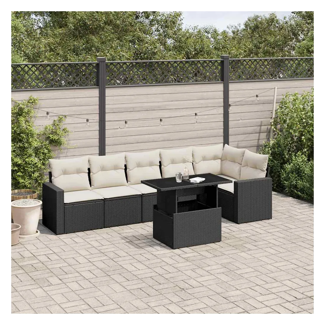 Cet ensemble de canapés de jardin est le complément parfait de votre arrière-cour, terrasse ou patio, offrant un espace confortable et accueillant pour discuter avec la famille et les amis ou simplement se détendre et profiter de l'extérieur. Matériau durable : la résine tressée, également connue sous le nom de poly rotin, est un matériau synthétique solide et nécessitant peu d'entretien qui ressemble au rotin naturel. Il est léger, facile à nettoyer et couramment utilisé pour les meubles d'extérieur en raison de sa durabilité et de ses propriétés de résistance aux intempéries.Dessus de table réglable : le dessus de table peut être soulevé pour rendre la table plus haute, ce qui transforme la table d'extérieur d'une table basse à une table de salle à manger. Elle est parfaite pour recevoir des invités ou prendre des repas à l'extérieur.Expérience d'assise confortable : ce mobilier d'extérieur, doté de coussins épais, offre une expérience d'assise confortable.Housse amovible et lavable : ces coussins de siège sont dotés de housses amovibles pour un lavage et un entretien faciles.Conception modulaire : cet ensemble de meubles d'extérieur a une conception modulaire, ce qui le rend complètement flexible et facile à déplacer, afin que vous puissiez créer un agencement de meubles d'extérieur personnalisé. Bon à savoir :Pour que vos meubles d'extérieur restent beaux, nous vous recommandons de les protéger avec une housse imperméable.
