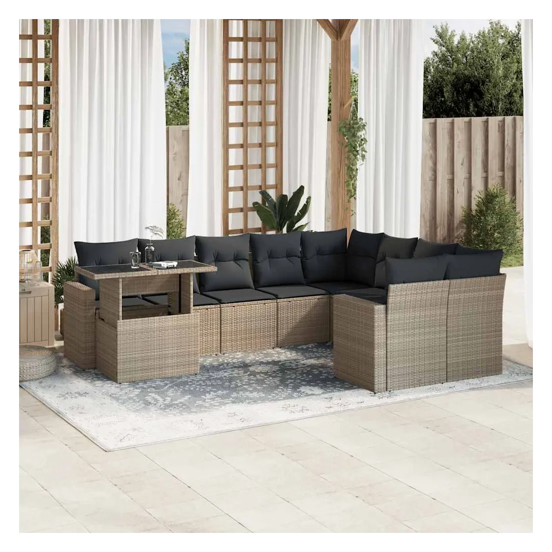 Cet ensemble de canapés de jardin est le complément parfait de votre arrière-cour, terrasse ou patio, offrant un espace confortable et accueillant pour discuter avec la famille et les amis ou simplement se détendre et profiter de l'extérieur. Matériau durable : la résine tressée, également connue sous le nom de poly rotin, est un matériau synthétique solide et nécessitant peu d'entretien qui ressemble au rotin naturel. Elle est légère, facile à nettoyer et couramment utilisée pour les meubles d'extérieur en raison de sa durabilité et de ses propriétés de résistance aux intempéries.Dessus de table réglable : le dessus de table peut être soulevé pour rendre la table plus haute, ce qui transforme la table d'extérieur d'une table basse à une table de salle à manger. Elle est parfaite pour recevoir des invités ou prendre des repas à l'extérieur.Expérience d'assise confortable : ce mobilier d'extérieur, doté de coussins épais, offre une expérience d'assise confortable.Housse amovible et lavable : ces coussins de siège sont dotés de housses amovibles pour un lavage et un entretien faciles.Conception modulaire : cet ensemble de meubles d'extérieur a une conception modulaire, ce qui le rend complètement flexible et facile à déplacer, afin que vous puissiez créer un agencement de meubles d'extérieur personnalisé. Bon à savoir :Pour que vos meubles d'extérieur restent beaux, nous vous recommandons de les protéger avec une housse imperméable.
