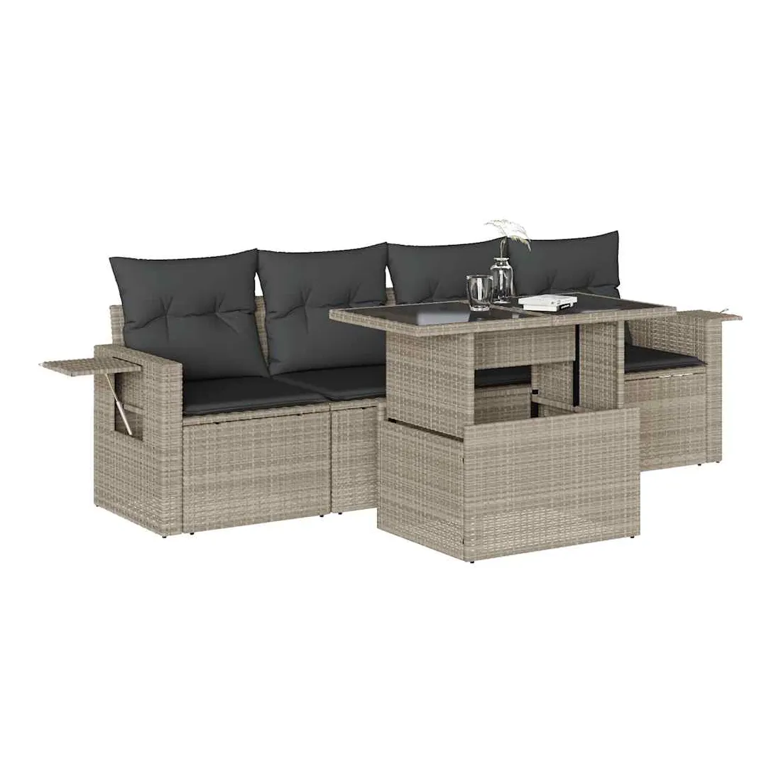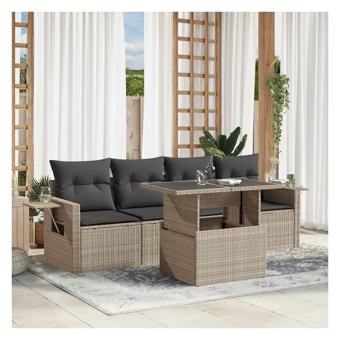 Cet ensemble de canapés de jardin est le complément parfait de votre arrière-cour, terrasse ou patio, offrant un espace confortable et accueillant pour discuter avec la famille et les amis ou simplement se détendre et profiter de l'extérieur. Matériau durable : la résine tressée, également connue sous le nom de poly rotin, est un matériau synthétique solide et nécessitant peu d'entretien qui ressemble au rotin naturel. Elle est légère, facile à nettoyer et couramment utilisée pour les meubles d'extérieur en raison de sa durabilité et de ses propriétés de résistance aux intempéries.Dessus de table réglable : le dessus de table peut être soulevé pour rendre la table plus haute, ce qui transforme la table d'extérieur d'une table basse à une table de salle à manger. Elle est parfaite pour recevoir des invités ou prendre des repas à l'extérieur.Table d'appoint pratique : ce mobilier d'extérieur comprend des tables d'appoint pliables avec un ressort à gaz sur les accoudoirs, offrant des endroits pratiques pour garder vos essentiels à portée de main. Expérience d'assise confortable : ce mobilier d'extérieur, doté de coussins épais, offre une expérience d'assise confortable.Conception modulaire : cet ensemble de meubles d'extérieur a une conception modulaire, ce qui le rend complètement flexible et facile à déplacer, afin que vous puissiez créer un agencement de meubles d'extérieur personnalisé. Bon à savoir :Pour que vos meubles d'extérieur restent beaux, nous vous recommandons de les protéger avec une housse imperméable.