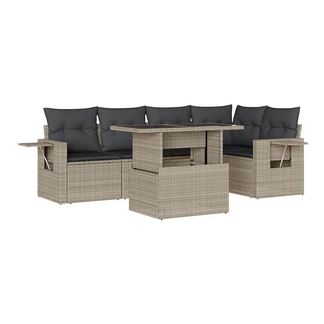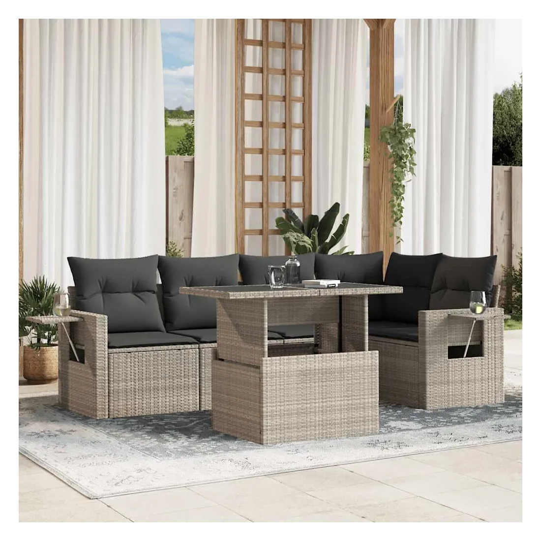 Cet ensemble de canapés de jardin est le complément parfait de votre arrière-cour, terrasse ou patio, offrant un espace confortable et accueillant pour discuter avec la famille et les amis ou simplement se détendre et profiter de l'extérieur. Matériau durable : la résine tressée, également connue sous le nom de poly rotin, est un matériau synthétique solide et nécessitant peu d'entretien qui ressemble au rotin naturel. Elle est légère, facile à nettoyer et couramment utilisée pour les meubles d'extérieur en raison de sa durabilité et de ses propriétés de résistance aux intempéries.Dessus de table réglable : le dessus de table peut être soulevé pour rendre la table plus haute, ce qui transforme la table d'extérieur d'une table basse à une table de salle à manger. Elle est parfaite pour recevoir des invités ou prendre des repas à l'extérieur.Table d'appoint pratique : ce mobilier d'extérieur comprend des tables d'appoint pliables avec un ressort à gaz sur les accoudoirs, offrant des endroits pratiques pour garder vos essentiels à portée de main. Expérience d'assise confortable : ce mobilier d'extérieur, doté de coussins épais, offre une expérience d'assise confortable.Conception modulaire : cet ensemble de meubles d'extérieur a une conception modulaire, ce qui le rend complètement flexible et facile à déplacer, afin que vous puissiez créer un agencement de meubles d'extérieur personnalisé. Bon à savoir :Pour que vos meubles d'extérieur restent beaux, nous vous recommandons de les protéger avec une housse imperméable.