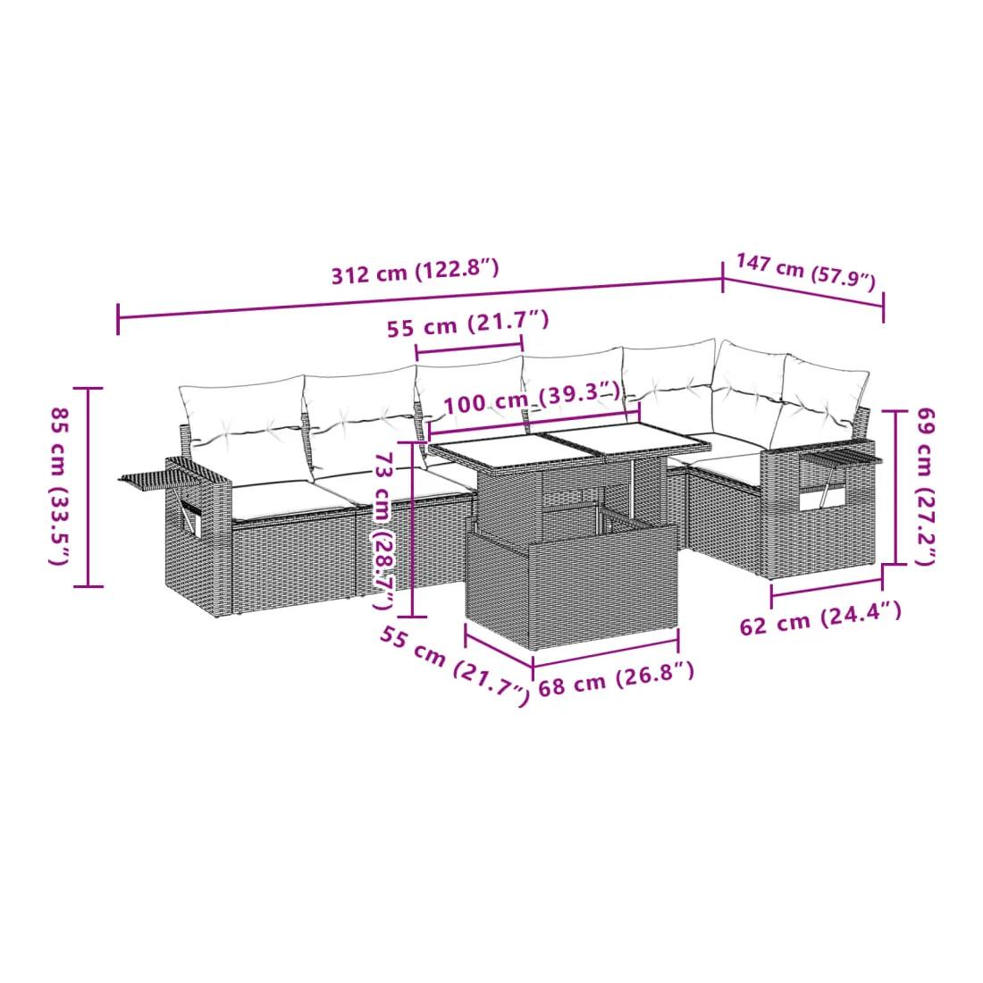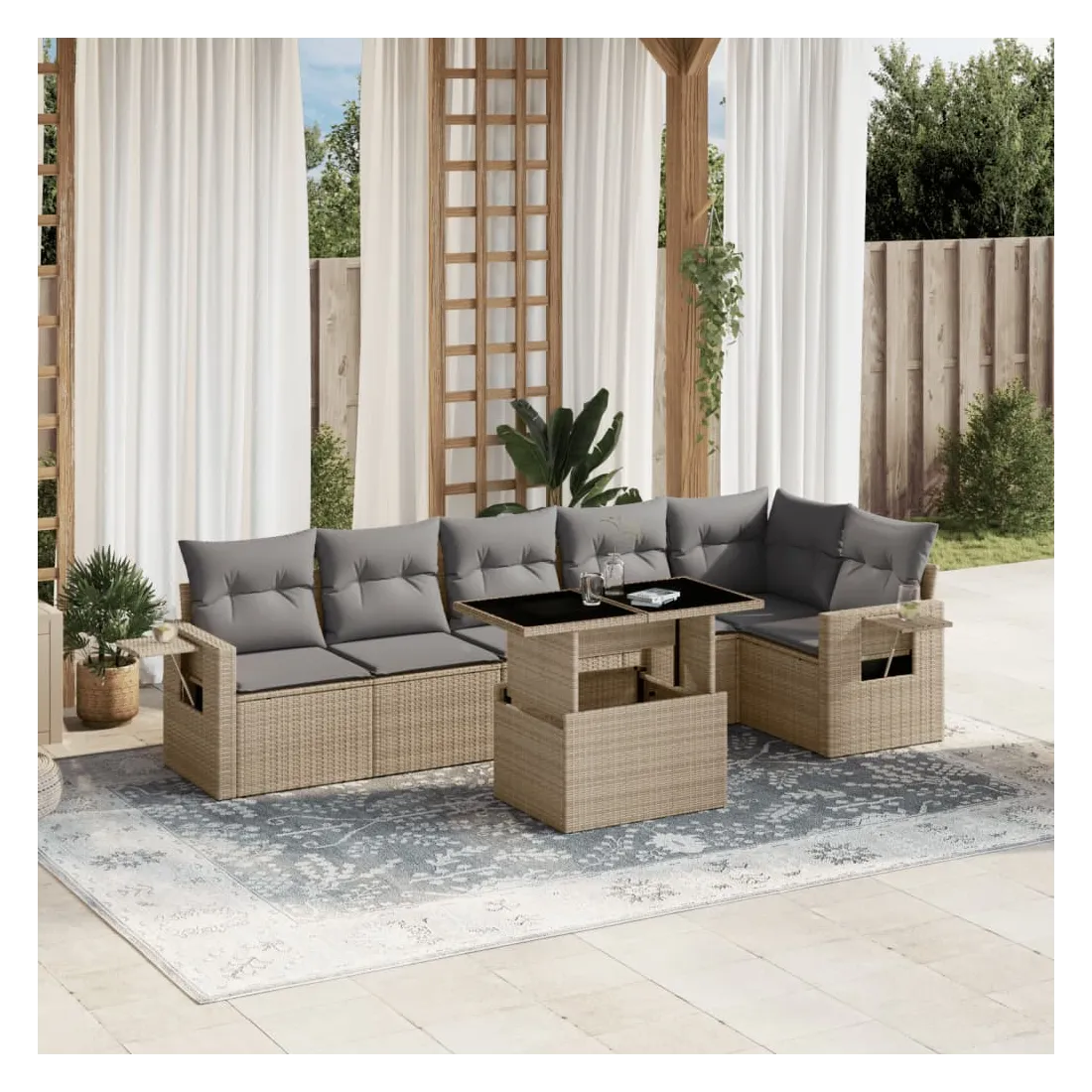 Cet ensemble de canapés de jardin est le complément parfait de votre arrière-cour, terrasse ou patio, offrant un espace confortable et accueillant pour discuter avec la famille et les amis ou simplement se détendre et profiter de l'extérieur. Matériau durable : la résine tressée, également connue sous le nom de poly rotin, est un matériau synthétique solide et nécessitant peu d'entretien qui ressemble au rotin naturel. Il est léger, facile à nettoyer et couramment utilisé pour les meubles d'extérieur en raison de sa durabilité et de ses propriétés de résistance aux intempéries.Dessus de table réglable : le dessus de table peut être soulevé pour rendre la table plus haute, ce qui transforme la table d'extérieur d'une table basse à une table de salle à manger. Elle est parfaite pour recevoir des invités ou prendre des repas à l'extérieur.Table d'appoint pratique : ce mobilier d'extérieur comprend des tables d'appoint pliables avec un ressort à gaz sur les accoudoirs, offrant des endroits pratiques pour garder vos essentiels à portée de main. Expérience d'assise confortable : ce mobilier d'extérieur, doté de coussins épais, offre une expérience d'assise confortable.Conception modulaire : cet ensemble de meubles d'extérieur a une conception modulaire, ce qui le rend complètement flexible et facile à déplacer, afin que vous puissiez créer un agencement de meubles d'extérieur personnalisé. Bon à savoir :Pour que vos meubles d'extérieur restent beaux, nous vous recommandons de les protéger avec une housse imperméable.