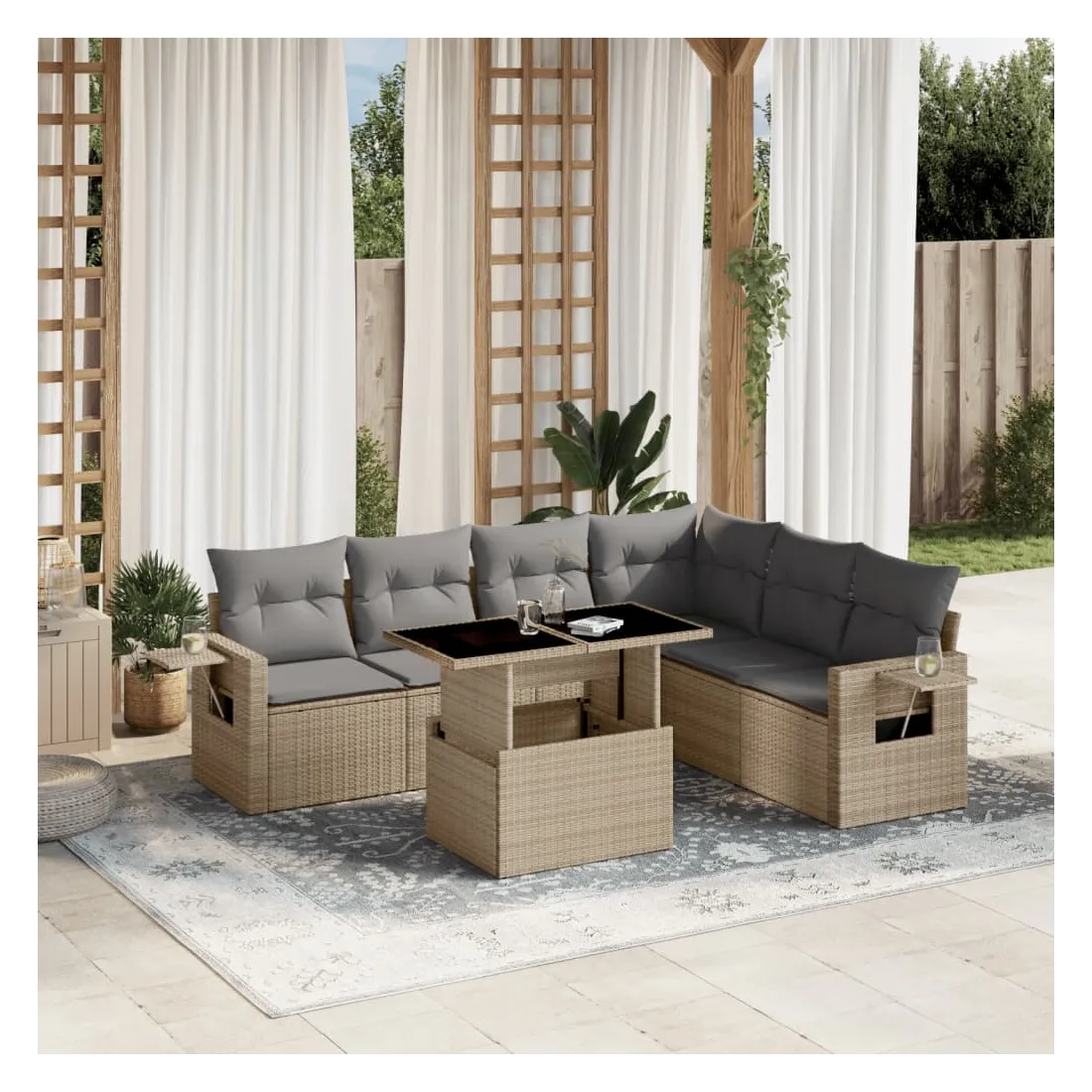 Salon de jardin avec coussins 7 pcs beige résine tressée