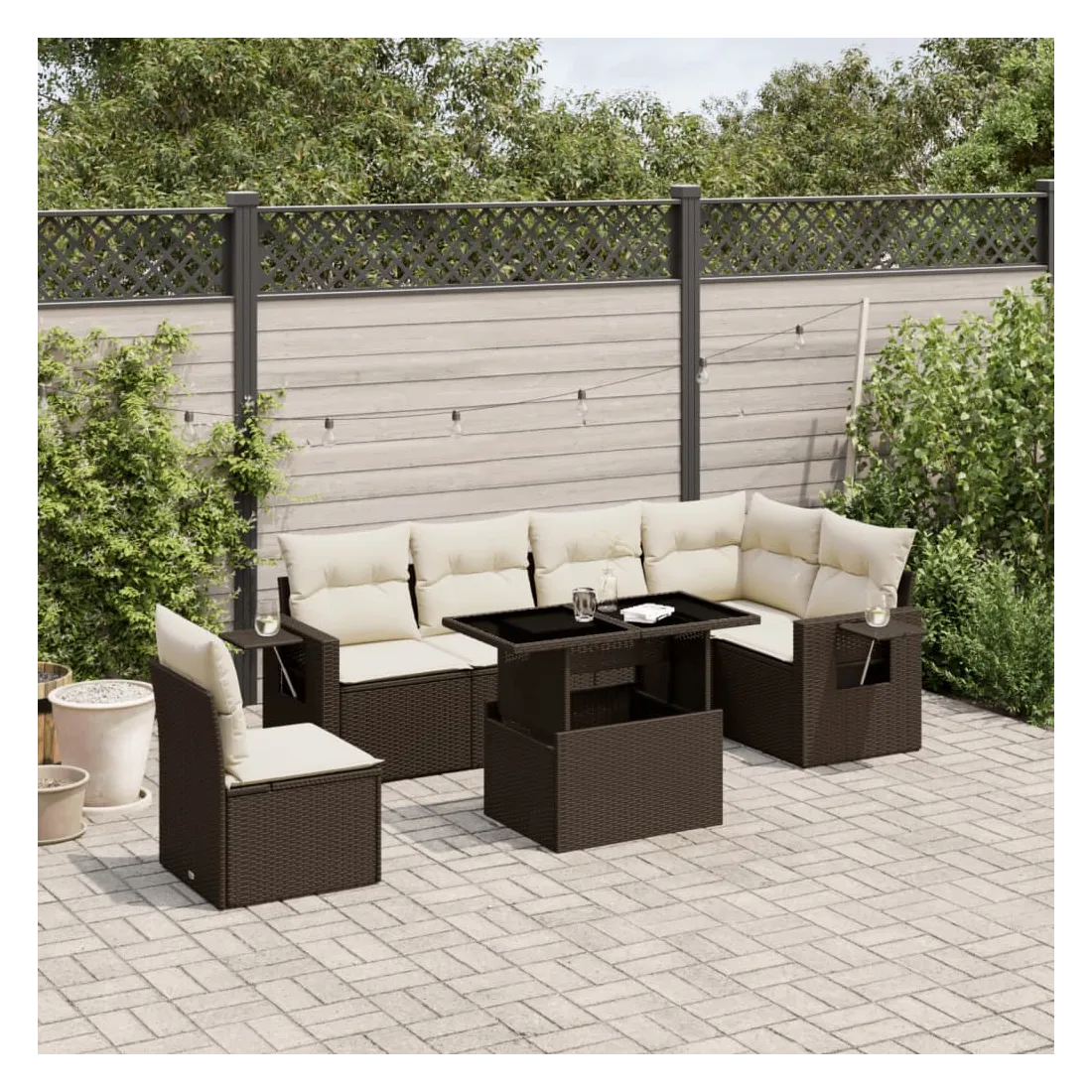 Cet ensemble de canapés de jardin est le complément parfait de votre arrière-cour, terrasse ou patio, offrant un espace confortable et accueillant pour discuter avec la famille et les amis ou simplement se détendre et profiter de l'extérieur. Matériau durable : la résine tressée, également connue sous le nom de poly rotin, est un matériau synthétique solide et nécessitant peu d'entretien qui ressemble au rotin naturel. Il est léger, facile à nettoyer et couramment utilisé pour les meubles d'extérieur en raison de sa durabilité et de ses propriétés de résistance aux intempéries.Dessus de table réglable : le dessus de table peut être soulevé pour rendre la table plus haute, ce qui transforme la table d'extérieur d'une table basse à une table de salle à manger. Elle est parfaite pour recevoir des invités ou prendre des repas à l'extérieur.Table d'appoint pratique : ce mobilier d'extérieur comprend des tables d'appoint pliables avec un ressort à gaz sur les accoudoirs, offrant des endroits pratiques pour garder vos essentiels à portée de main. Expérience d'assise confortable : ce mobilier d'extérieur, doté de coussins épais, offre une expérience d'assise confortable.Conception modulaire : cet ensemble de meubles d'extérieur a une conception modulaire, ce qui le rend complètement flexible et facile à déplacer, afin que vous puissiez créer un agencement de meubles d'extérieur personnalisé. Bon à savoir :Pour que vos meubles d'extérieur restent beaux, nous vous recommandons de les protéger avec une housse imperméable.