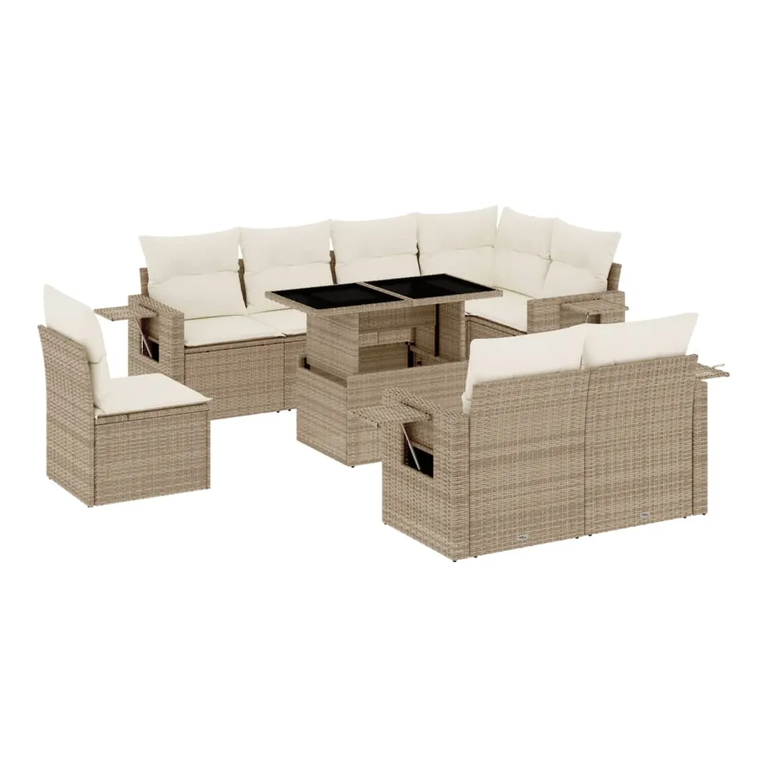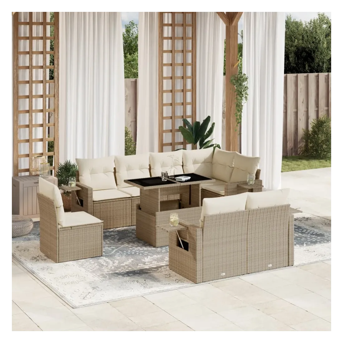 Cet ensemble de canapés de jardin est le complément parfait de votre arrière-cour, terrasse ou patio, offrant un espace confortable et accueillant pour discuter avec la famille et les amis ou simplement se détendre et profiter de l'extérieur. Matériau durable : la résine tressée, également connue sous le nom de poly rotin, est un matériau synthétique solide et nécessitant peu d'entretien qui ressemble au rotin naturel. Il est léger, facile à nettoyer et couramment utilisé pour les meubles d'extérieur en raison de sa durabilité et de ses propriétés de résistance aux intempéries.Dessus de table réglable : le dessus de table peut être soulevé pour rendre la table plus haute, ce qui transforme la table d'extérieur d'une table basse à une table de salle à manger. Elle est parfaite pour recevoir des invités ou prendre des repas à l'extérieur.Table d'appoint pratique : ce mobilier d'extérieur comprend des tables d'appoint pliables avec un ressort à gaz sur les accoudoirs, offrant des endroits pratiques pour garder vos essentiels à portée de main. Expérience d'assise confortable : ce mobilier d'extérieur, doté de coussins épais, offre une expérience d'assise confortable.Conception modulaire : cet ensemble de meubles d'extérieur a une conception modulaire, ce qui le rend complètement flexible et facile à déplacer, afin que vous puissiez créer un agencement de meubles d'extérieur personnalisé. Bon à savoir :Pour que vos meubles d'extérieur restent beaux, nous vous recommandons de les protéger avec une housse imperméable.