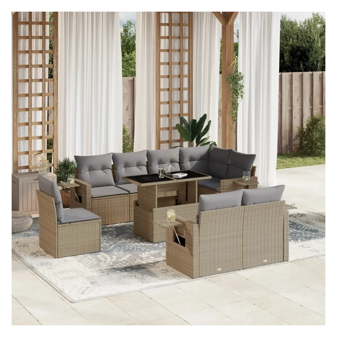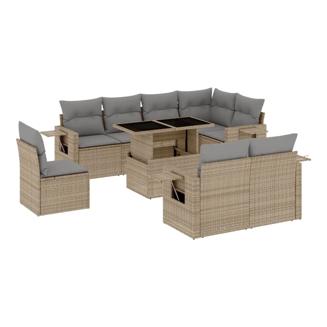 Cet ensemble de canapés de jardin est le complément parfait de votre arrière-cour, terrasse ou patio, offrant un espace confortable et accueillant pour discuter avec la famille et les amis ou simplement se détendre et profiter de l'extérieur. Matériau durable : la résine tressée, également connue sous le nom de poly rotin, est un matériau synthétique solide et nécessitant peu d'entretien qui ressemble au rotin naturel. Il est léger, facile à nettoyer et couramment utilisé pour les meubles d'extérieur en raison de sa durabilité et de ses propriétés de résistance aux intempéries.Dessus de table réglable : le dessus de table peut être soulevé pour rendre la table plus haute, ce qui transforme la table d'extérieur d'une table basse à une table de salle à manger. Elle est parfaite pour recevoir des invités ou prendre des repas à l'extérieur.Table d'appoint pratique : ce mobilier d'extérieur comprend des tables d'appoint pliables avec un ressort à gaz sur les accoudoirs, offrant des endroits pratiques pour garder vos essentiels à portée de main. Expérience d'assise confortable : ce mobilier d'extérieur, doté de coussins épais, offre une expérience d'assise confortable.Conception modulaire : cet ensemble de meubles d'extérieur a une conception modulaire, ce qui le rend complètement flexible et facile à déplacer, afin que vous puissiez créer un agencement de meubles d'extérieur personnalisé. Bon à savoir :Pour que vos meubles d'extérieur restent beaux, nous vous recommandons de les protéger avec une housse imperméable.