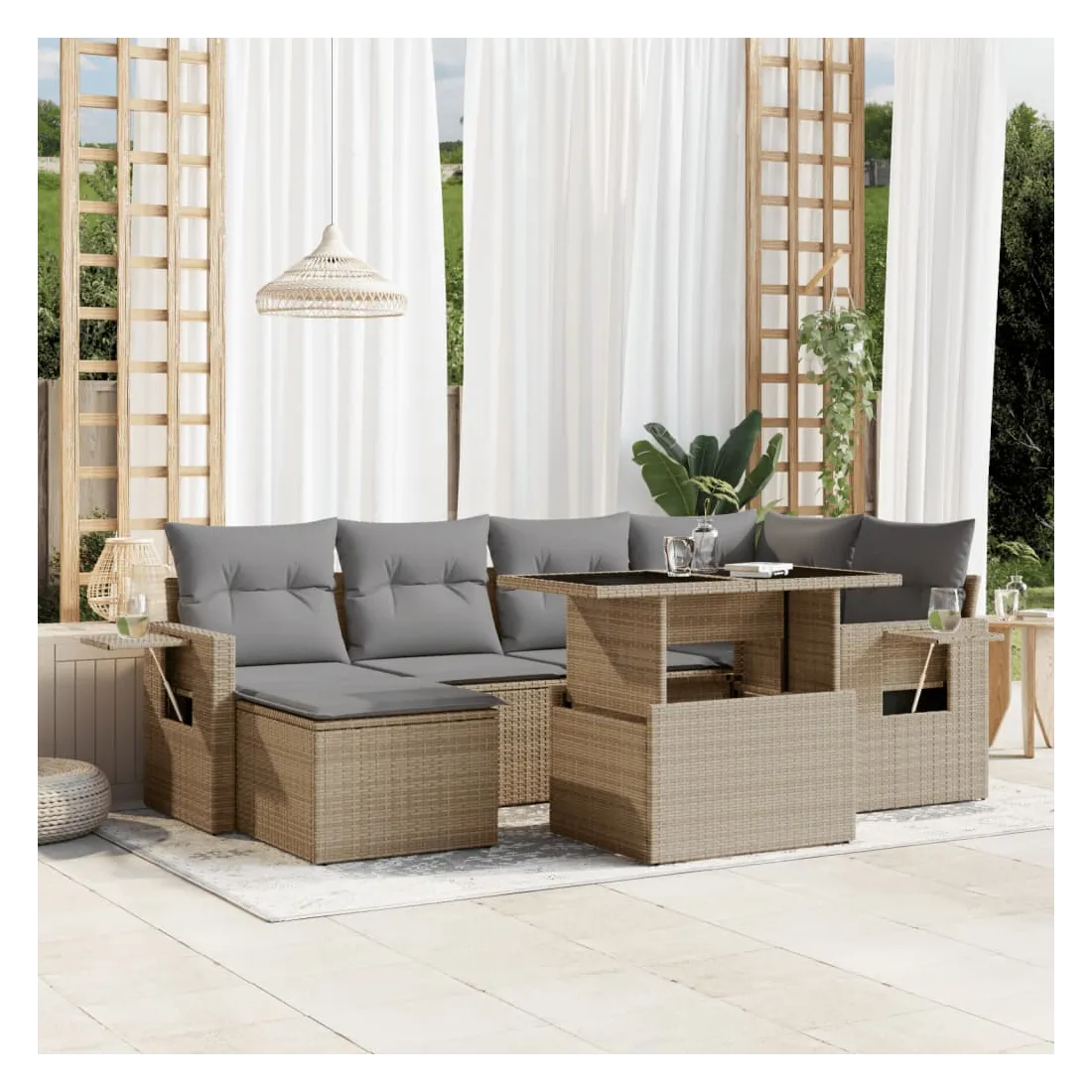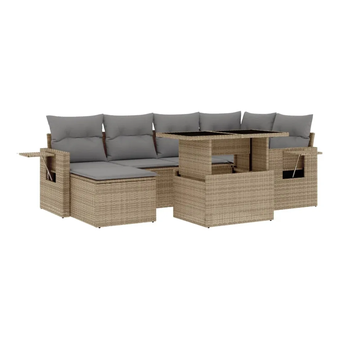 Cet ensemble de canapés de jardin est le complément parfait de votre arrière-cour, terrasse ou patio, offrant un espace confortable et accueillant pour discuter avec la famille et les amis ou simplement se détendre et profiter de l'extérieur. Matériau durable : la résine tressée, également connue sous le nom de poly rotin, est un matériau synthétique solide et nécessitant peu d'entretien qui ressemble au rotin naturel. Il est léger, facile à nettoyer et couramment utilisé pour les meubles d'extérieur en raison de sa durabilité et de ses propriétés de résistance aux intempéries.Dessus de table réglable : le dessus de table peut être soulevé pour rendre la table plus haute, ce qui transforme la table d'extérieur d'une table basse à une table de salle à manger. Elle est parfaite pour recevoir des invités ou prendre des repas à l'extérieur.Table d'appoint pratique : ce mobilier d'extérieur comprend des tables d'appoint pliables avec un ressort à gaz sur les accoudoirs, offrant des endroits pratiques pour garder vos essentiels à portée de main. Expérience d'assise confortable : ce mobilier d'extérieur, doté de coussins épais, offre une expérience d'assise confortable.Conception modulaire : cet ensemble de meubles d'extérieur a une conception modulaire, ce qui le rend complètement flexible et facile à déplacer, afin que vous puissiez créer un agencement de meubles d'extérieur personnalisé. Bon à savoir :Pour que vos meubles d'extérieur restent beaux, nous vous recommandons de les protéger avec une housse imperméable.