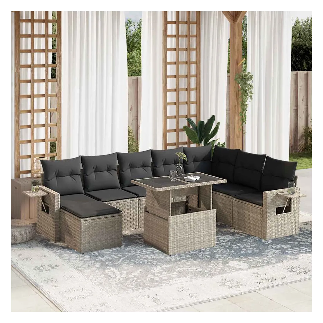 Cet ensemble de canapés de jardin est le complément parfait de votre arrière-cour, terrasse ou patio, offrant un espace confortable et accueillant pour discuter avec la famille et les amis ou simplement se détendre et profiter de l'extérieur. Matériau durable : la résine tressée, également connue sous le nom de poly rotin, est un matériau synthétique solide et nécessitant peu d'entretien qui ressemble au rotin naturel. Elle est légère, facile à nettoyer et couramment utilisée pour les meubles d'extérieur en raison de sa durabilité et de ses propriétés de résistance aux intempéries.Dessus de table réglable : le dessus de table peut être soulevé pour rendre la table plus haute, ce qui transforme la table d'extérieur d'une table basse à une table de salle à manger. Elle est parfaite pour recevoir des invités ou prendre des repas à l'extérieur.Table d'appoint pratique : ce mobilier d'extérieur comprend des tables d'appoint pliables avec un ressort à gaz sur les accoudoirs, offrant des endroits pratiques pour garder vos essentiels à portée de main. Expérience d'assise confortable : ce mobilier d'extérieur, doté de coussins épais, offre une expérience d'assise confortable.Conception modulaire : cet ensemble de meubles d'extérieur a une conception modulaire, ce qui le rend complètement flexible et facile à déplacer, afin que vous puissiez créer un agencement de meubles d'extérieur personnalisé. Bon à savoir :Pour que vos meubles d'extérieur restent beaux, nous vous recommandons de les protéger avec une housse imperméable.