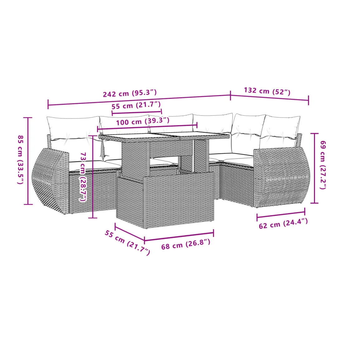 Cet ensemble de canapés de jardin est le complément parfait de votre arrière-cour, terrasse ou patio, offrant un espace confortable et accueillant pour discuter avec la famille et les amis ou simplement se détendre et profiter de l'extérieur. Matériau durable : la résine tressée, également connue sous le nom de poly rotin, est un matériau synthétique solide et nécessitant peu d'entretien qui ressemble au rotin naturel. Il est léger, facile à nettoyer et couramment utilisé pour les meubles d'extérieur en raison de sa durabilité et de ses propriétés de résistance aux intempéries.Dessus de table réglable : le dessus de table peut être soulevé pour rendre la table plus haute, ce qui transforme la table d'extérieur d'une table basse à une table de salle à manger. Elle est parfaite pour recevoir des invités ou prendre des repas à l'extérieur.Expérience d'assise confortable : ce mobilier d'extérieur, doté de coussins épais, offre une expérience d'assise confortable.Housse amovible et lavable : ces coussins de siège sont dotés de housses amovibles pour un lavage et un entretien faciles.Conception modulaire : cet ensemble de meubles d'extérieur a une conception modulaire, ce qui le rend complètement flexible et facile à déplacer, afin que vous puissiez créer un agencement de meubles d'extérieur personnalisé. Bon à savoir :Pour que vos meubles d'extérieur restent beaux, nous vous recommandons de les protéger avec une housse imperméable.