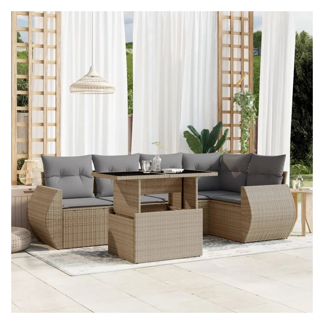 Cet ensemble de canapés de jardin est le complément parfait de votre arrière-cour, terrasse ou patio, offrant un espace confortable et accueillant pour discuter avec la famille et les amis ou simplement se détendre et profiter de l'extérieur. Matériau durable : la résine tressée, également connue sous le nom de poly rotin, est un matériau synthétique solide et nécessitant peu d'entretien qui ressemble au rotin naturel. Il est léger, facile à nettoyer et couramment utilisé pour les meubles d'extérieur en raison de sa durabilité et de ses propriétés de résistance aux intempéries.Dessus de table réglable : le dessus de table peut être soulevé pour rendre la table plus haute, ce qui transforme la table d'extérieur d'une table basse à une table de salle à manger. Elle est parfaite pour recevoir des invités ou prendre des repas à l'extérieur.Expérience d'assise confortable : ce mobilier d'extérieur, doté de coussins épais, offre une expérience d'assise confortable.Housse amovible et lavable : ces coussins de siège sont dotés de housses amovibles pour un lavage et un entretien faciles.Conception modulaire : cet ensemble de meubles d'extérieur a une conception modulaire, ce qui le rend complètement flexible et facile à déplacer, afin que vous puissiez créer un agencement de meubles d'extérieur personnalisé. Bon à savoir :Pour que vos meubles d'extérieur restent beaux, nous vous recommandons de les protéger avec une housse imperméable.