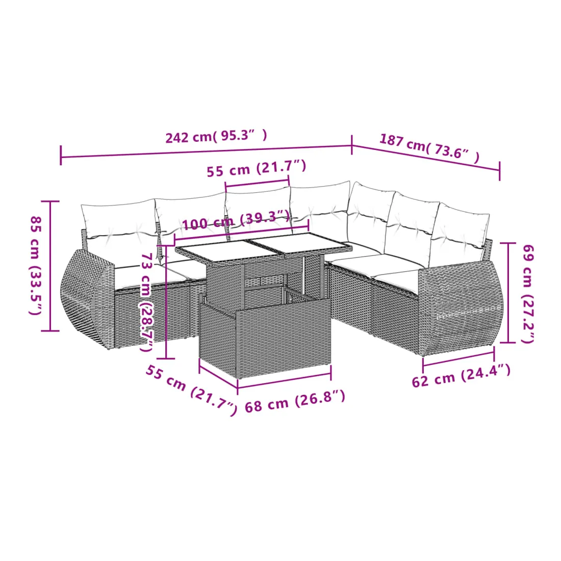 Cet ensemble de canapés de jardin est le complément parfait de votre arrière-cour, terrasse ou patio, offrant un espace confortable et accueillant pour discuter avec la famille et les amis ou simplement se détendre et profiter de l'extérieur. Matériau durable : la résine tressée, également connue sous le nom de poly rotin, est un matériau synthétique solide et nécessitant peu d'entretien qui ressemble au rotin naturel. Il est léger, facile à nettoyer et couramment utilisé pour les meubles d'extérieur en raison de sa durabilité et de ses propriétés de résistance aux intempéries.Dessus de table réglable : le dessus de table peut être soulevé pour rendre la table plus haute, ce qui transforme la table d'extérieur d'une table basse à une table de salle à manger. Elle est parfaite pour recevoir des invités ou prendre des repas à l'extérieur.Expérience d'assise confortable : ce mobilier d'extérieur, doté de coussins épais, offre une expérience d'assise confortable.Housse amovible et lavable : ces coussins de siège sont dotés de housses amovibles pour un lavage et un entretien faciles.Conception modulaire : cet ensemble de meubles d'extérieur a une conception modulaire, ce qui le rend complètement flexible et facile à déplacer, afin que vous puissiez créer un agencement de meubles d'extérieur personnalisé. Bon à savoir :Pour que vos meubles d'extérieur restent beaux, nous vous recommandons de les protéger avec une housse imperméable.