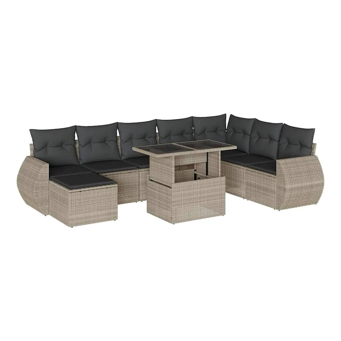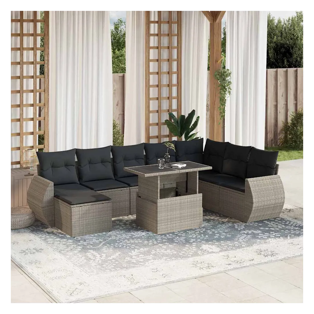 Cet ensemble de canapés de jardin est le complément parfait de votre arrière-cour, terrasse ou patio, offrant un espace confortable et accueillant pour discuter avec la famille et les amis ou simplement se détendre et profiter de l'extérieur. Matériau durable : la résine tressée, également connue sous le nom de poly rotin, est un matériau synthétique solide et nécessitant peu d'entretien qui ressemble au rotin naturel. Elle est légère, facile à nettoyer et couramment utilisée pour les meubles d'extérieur en raison de sa durabilité et de ses propriétés de résistance aux intempéries.Dessus de table réglable : le dessus de table peut être soulevé pour rendre la table plus haute, ce qui transforme la table d'extérieur d'une table basse à une table de salle à manger. Elle est parfaite pour recevoir des invités ou prendre des repas à l'extérieur.Expérience d'assise confortable : ce mobilier d'extérieur, doté de coussins épais, offre une expérience d'assise confortable.Housse amovible et lavable : ces coussins de siège sont dotés de housses amovibles pour un lavage et un entretien faciles.Conception modulaire : cet ensemble de meubles d'extérieur a une conception modulaire, ce qui le rend complètement flexible et facile à déplacer, afin que vous puissiez créer un agencement de meubles d'extérieur personnalisé. Bon à savoir :Pour que vos meubles d'extérieur restent beaux, nous vous recommandons de les protéger avec une housse imperméable.