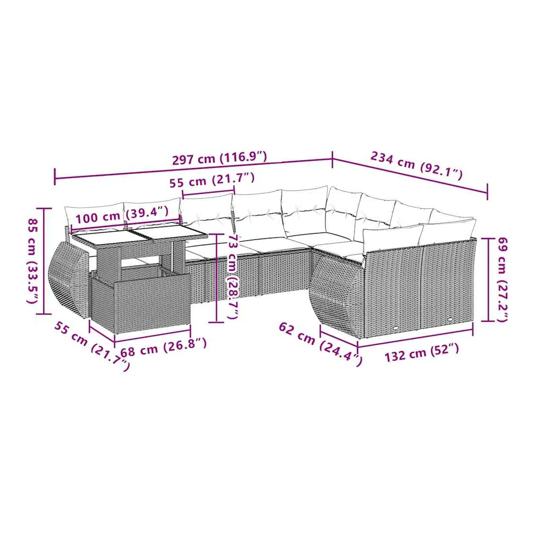 Cet ensemble de canapés de jardin est le complément parfait de votre arrière-cour, terrasse ou patio, offrant un espace confortable et accueillant pour discuter avec la famille et les amis ou simplement se détendre et profiter de l'extérieur. Matériau durable : la résine tressée, également connue sous le nom de poly rotin, est un matériau synthétique solide et nécessitant peu d'entretien qui ressemble au rotin naturel. Il est léger, facile à nettoyer et couramment utilisé pour les meubles d'extérieur en raison de sa durabilité et de ses propriétés de résistance aux intempéries.Dessus de table réglable : le dessus de table peut être soulevé pour rendre la table plus haute, ce qui transforme la table d'extérieur d'une table basse à une table de salle à manger. Elle est parfaite pour recevoir des invités ou prendre des repas à l'extérieur.Expérience d'assise confortable : ce mobilier d'extérieur, doté de coussins épais, offre une expérience d'assise confortable.Housse amovible et lavable : ces coussins de siège sont dotés de housses amovibles pour un lavage et un entretien faciles.Conception modulaire : cet ensemble de meubles d'extérieur a une conception modulaire, ce qui le rend complètement flexible et facile à déplacer, afin que vous puissiez créer un agencement de meubles d'extérieur personnalisé. Bon à savoir :Pour que vos meubles d'extérieur restent beaux, nous vous recommandons de les protéger avec une housse imperméable.