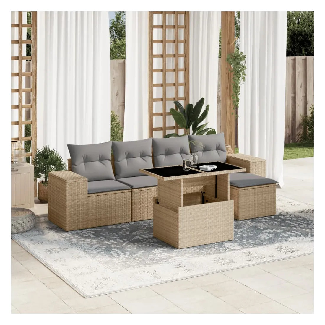 Cet ensemble de canapés de jardin est le complément parfait de votre arrière-cour, terrasse ou patio, offrant un espace confortable et accueillant pour discuter avec la famille et les amis ou simplement se détendre et profiter de l'extérieur. Matériau durable : la résine tressée, également connue sous le nom de poly rotin, est un matériau synthétique solide et nécessitant peu d'entretien qui ressemble au rotin naturel. Il est léger, facile à nettoyer et couramment utilisé pour les meubles d'extérieur en raison de sa durabilité et de ses propriétés de résistance aux intempéries.Dessus de table réglable : le dessus de table peut être soulevé pour rendre la table plus haute, ce qui transforme la table d'extérieur d'une table basse à une table de salle à manger. Elle est parfaite pour recevoir des invités ou prendre des repas à l'extérieur.Expérience d'assise confortable : ce mobilier d'extérieur, doté de coussins épais, offre une expérience d'assise confortable.Housse amovible et lavable : ces coussins de siège sont dotés de housses amovibles pour un lavage et un entretien faciles.Conception modulaire : cet ensemble de meubles d'extérieur a une conception modulaire, ce qui le rend complètement flexible et facile à déplacer, afin que vous puissiez créer un agencement de meubles d'extérieur personnalisé. Bon à savoir :Pour que vos meubles d'extérieur restent beaux, nous vous recommandons de les protéger avec une housse imperméable.