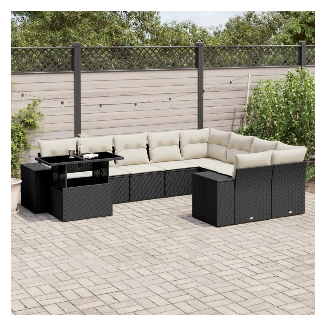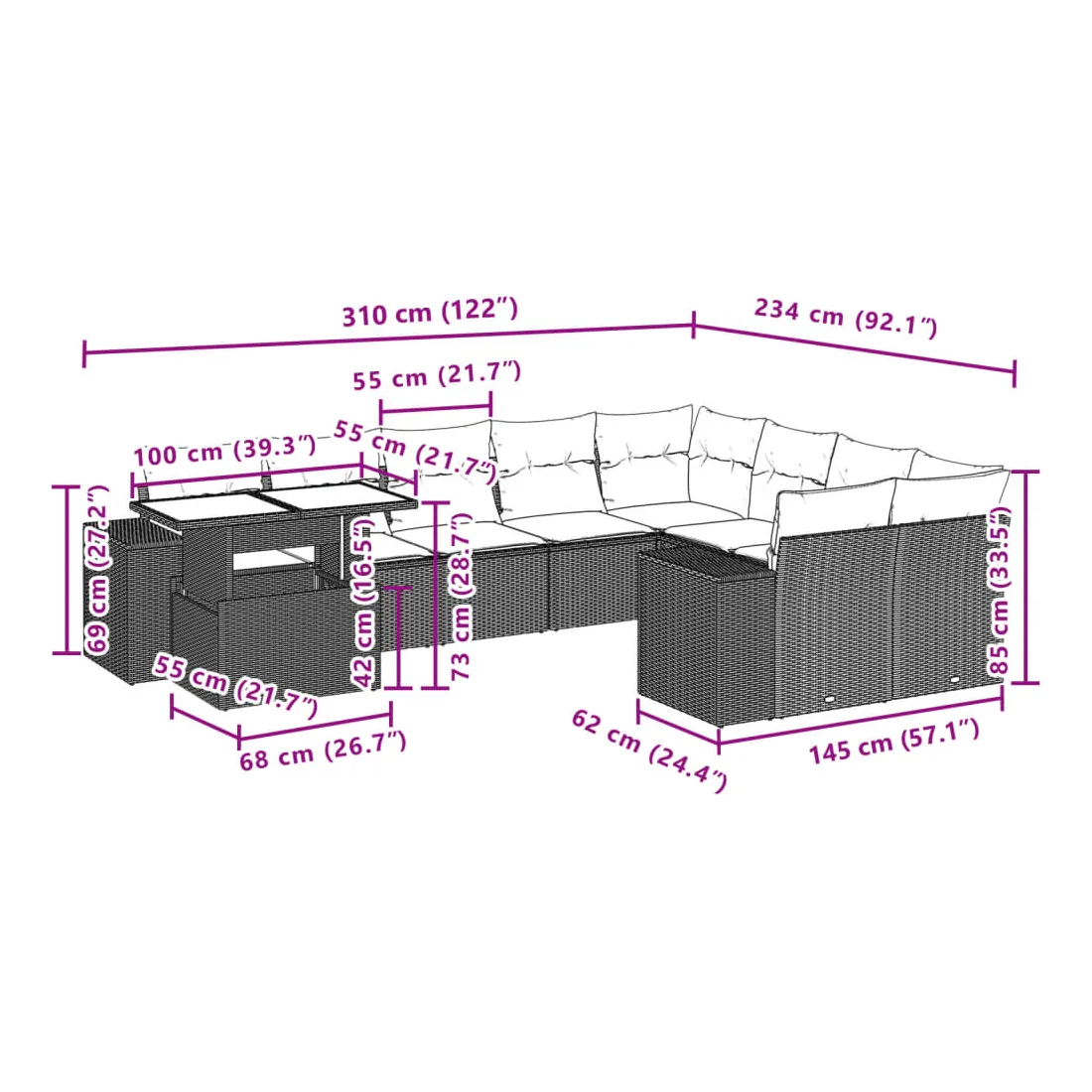 Cet ensemble de canapés de jardin est le complément parfait de votre arrière-cour, terrasse ou patio, offrant un espace confortable et accueillant pour discuter avec la famille et les amis ou simplement se détendre et profiter de l'extérieur. Matériau durable : la résine tressée, également connue sous le nom de poly rotin, est un matériau synthétique solide et nécessitant peu d'entretien qui ressemble au rotin naturel. Il est léger, facile à nettoyer et couramment utilisé pour les meubles d'extérieur en raison de sa durabilité et de ses propriétés de résistance aux intempéries.Dessus de table réglable : le dessus de table peut être soulevé pour rendre la table plus haute, ce qui transforme la table d'extérieur d'une table basse à une table de salle à manger. Elle est parfaite pour recevoir des invités ou prendre des repas à l'extérieur.Expérience d'assise confortable : ce mobilier d'extérieur, doté de coussins épais, offre une expérience d'assise confortable.Housse amovible et lavable : ces coussins de siège sont dotés de housses amovibles pour un lavage et un entretien faciles.Conception modulaire : cet ensemble de meubles d'extérieur a une conception modulaire, ce qui le rend complètement flexible et facile à déplacer, afin que vous puissiez créer un agencement de meubles d'extérieur personnalisé. Bon à savoir :Pour que vos meubles d'extérieur restent beaux, nous vous recommandons de les protéger avec une housse imperméable.
