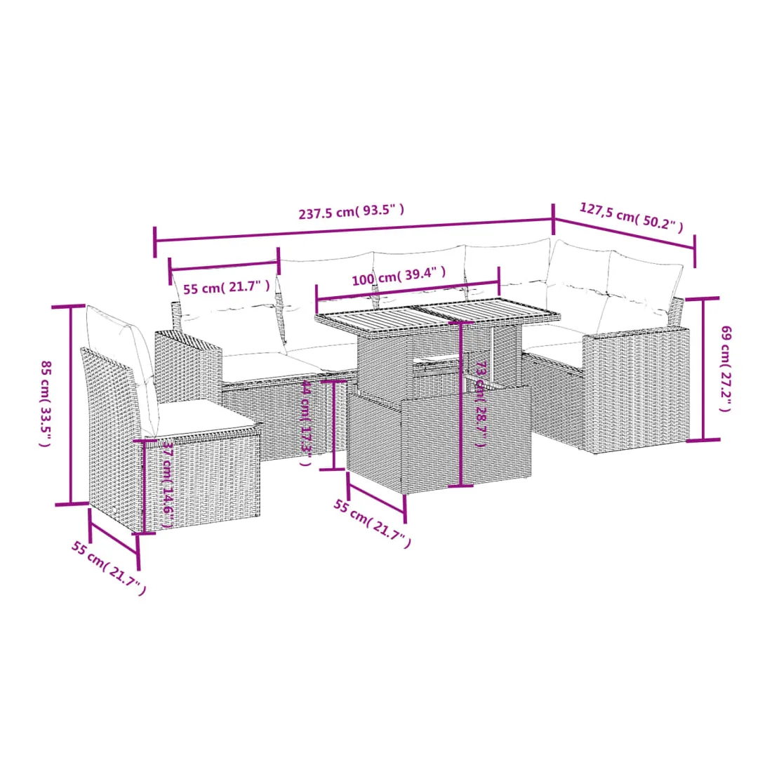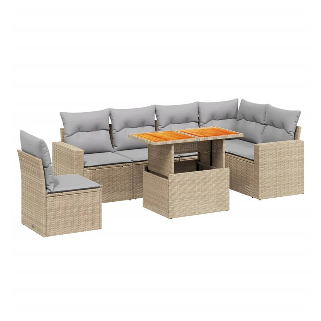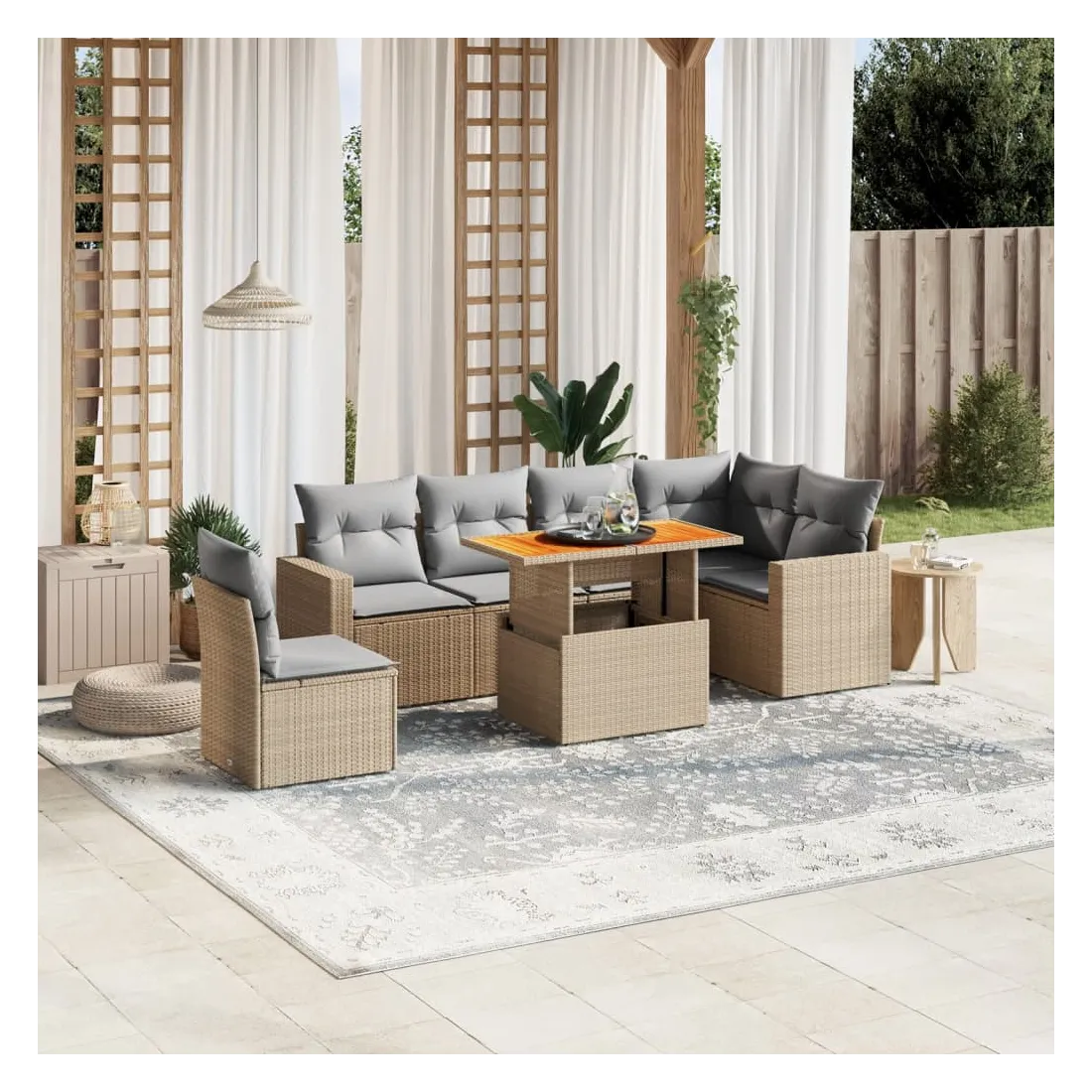 Cet ensemble de canapés de jardin est le complément parfait de votre arrière-cour, terrasse ou patio, offrant un espace confortable et accueillant pour discuter avec la famille et les amis ou simplement se détendre et profiter de l'extérieur. Matériau durable : la résine tressée, également connue sous le nom de poly rotin, est un matériau synthétique solide et nécessitant peu d'entretien qui ressemble au rotin naturel. Il est léger, facile à nettoyer et couramment utilisé pour les meubles d'extérieur en raison de sa durabilité et de ses propriétés de résistance aux intempéries.Dessus de table réglable : le dessus de table peut être soulevé pour rendre la table plus haute, ce qui transforme la table d'extérieur d'une table basse à une table de salle à manger. Elle est parfaite pour recevoir des invités ou prendre des repas à l'extérieur.Expérience d'assise confortable : ce mobilier d'extérieur, doté de coussins épais, offre une expérience d'assise confortable.Housse amovible et lavable : ces coussins de siège sont dotés de housses amovibles pour un lavage et un entretien faciles.Conception modulaire : cet ensemble de meubles d'extérieur a une conception modulaire, ce qui le rend complètement flexible et facile à déplacer, afin que vous puissiez créer un agencement de meubles d'extérieur personnalisé. Bon à savoir :Pour que vos meubles d'extérieur restent beaux, nous vous recommandons de les protéger avec une housse imperméable.