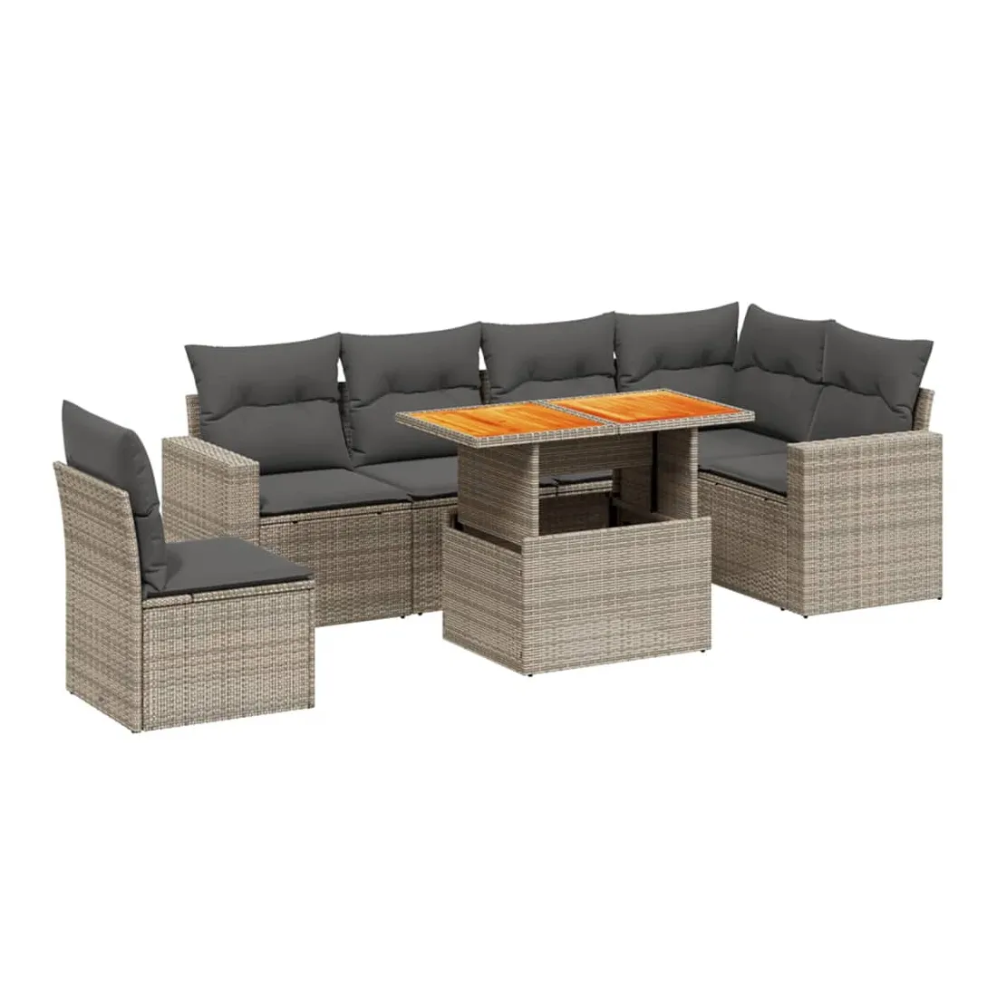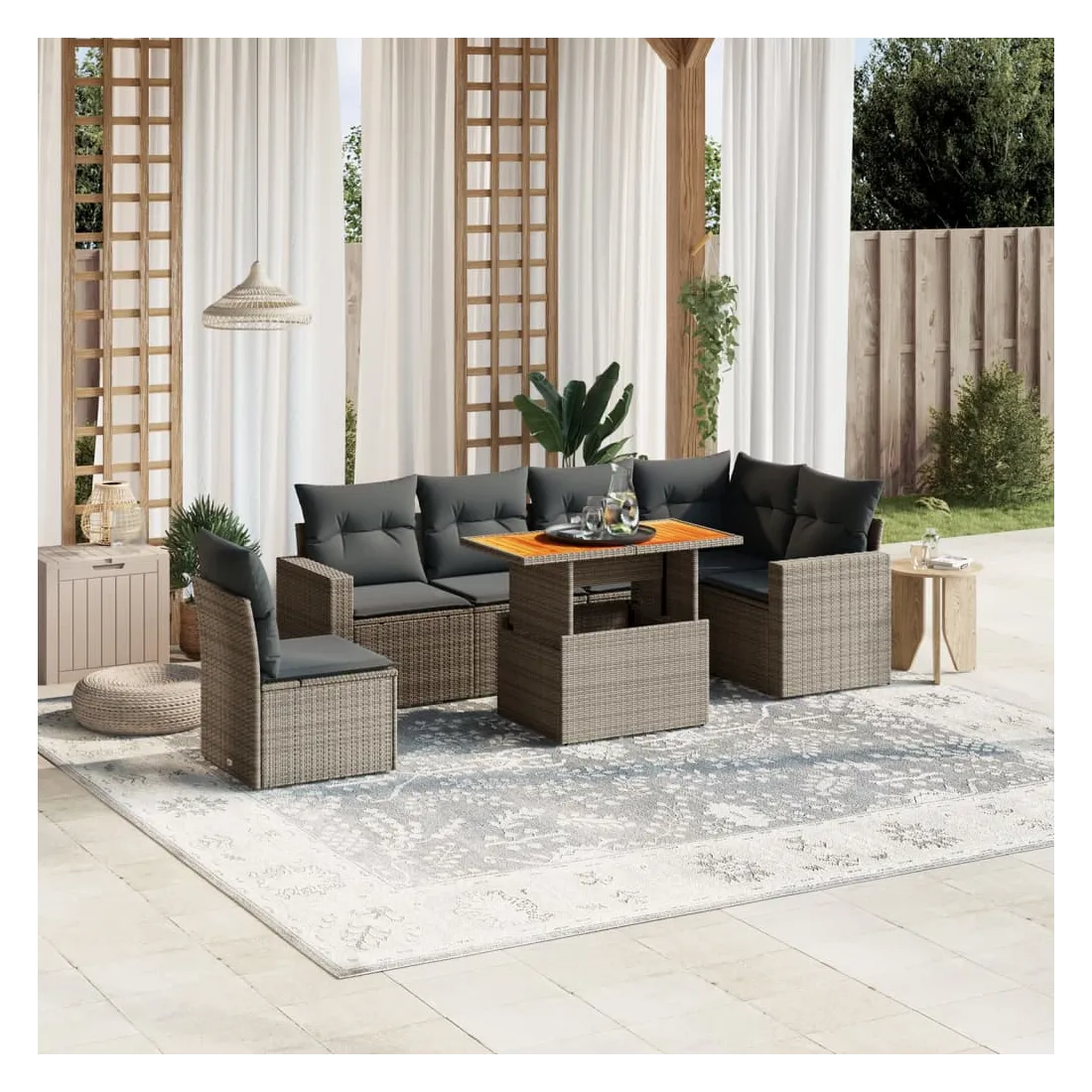 Cet ensemble de canapés de jardin est le complément parfait de votre arrière-cour, terrasse ou patio, offrant un espace confortable et accueillant pour discuter avec la famille et les amis ou simplement se détendre et profiter de l'extérieur. Matériau durable : la résine tressée, également connue sous le nom de poly rotin, est un matériau synthétique solide et nécessitant peu d'entretien qui ressemble au rotin naturel. Il est léger, facile à nettoyer et couramment utilisé pour les meubles d'extérieur en raison de sa durabilité et de ses propriétés de résistance aux intempéries.Dessus de table réglable : le dessus de table peut être soulevé pour rendre la table plus haute, ce qui transforme la table d'extérieur d'une table basse à une table de salle à manger. Elle est parfaite pour recevoir des invités ou prendre des repas à l'extérieur.Expérience d'assise confortable : ce mobilier d'extérieur, doté de coussins épais, offre une expérience d'assise confortable.Housse amovible et lavable : ces coussins de siège sont dotés de housses amovibles pour un lavage et un entretien faciles.Conception modulaire : cet ensemble de meubles d'extérieur a une conception modulaire, ce qui le rend complètement flexible et facile à déplacer, afin que vous puissiez créer un agencement de meubles d'extérieur personnalisé. Bon à savoir :Pour que vos meubles d'extérieur restent beaux, nous vous recommandons de les protéger avec une housse imperméable.