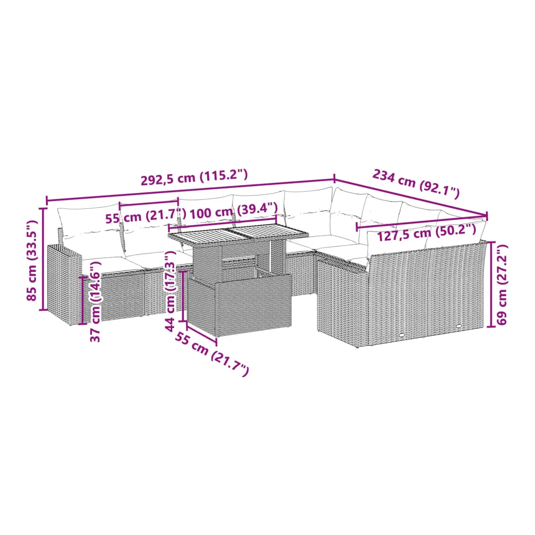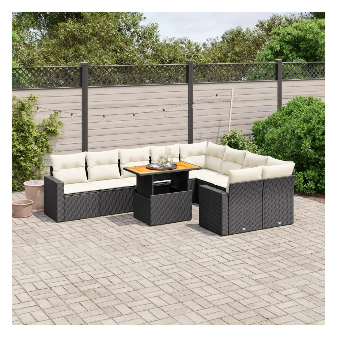 Cet ensemble de canapés de jardin est le complément parfait de votre arrière-cour, terrasse ou patio, offrant un espace confortable et accueillant pour discuter avec la famille et les amis ou simplement se détendre et profiter de l'extérieur. Matériau durable : la résine tressée, également connue sous le nom de poly rotin, est un matériau synthétique solide et nécessitant peu d'entretien qui ressemble au rotin naturel. Il est léger, facile à nettoyer et couramment utilisé pour les meubles d'extérieur en raison de sa durabilité et de ses propriétés de résistance aux intempéries.Dessus de table réglable : le dessus de table peut être soulevé pour rendre la table plus haute, ce qui transforme la table d'extérieur d'une table basse à une table de salle à manger. Elle est parfaite pour recevoir des invités ou prendre des repas à l'extérieur.Expérience d'assise confortable : ce mobilier d'extérieur, doté de coussins épais, offre une expérience d'assise confortable.Housse amovible et lavable : ces coussins de siège sont dotés de housses amovibles pour un lavage et un entretien faciles.Conception modulaire : cet ensemble de meubles d'extérieur a une conception modulaire, ce qui le rend complètement flexible et facile à déplacer, afin que vous puissiez créer un agencement de meubles d'extérieur personnalisé. Bon à savoir :Pour que vos meubles d'extérieur restent beaux, nous vous recommandons de les protéger avec une housse imperméable.