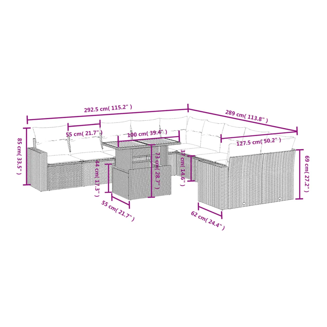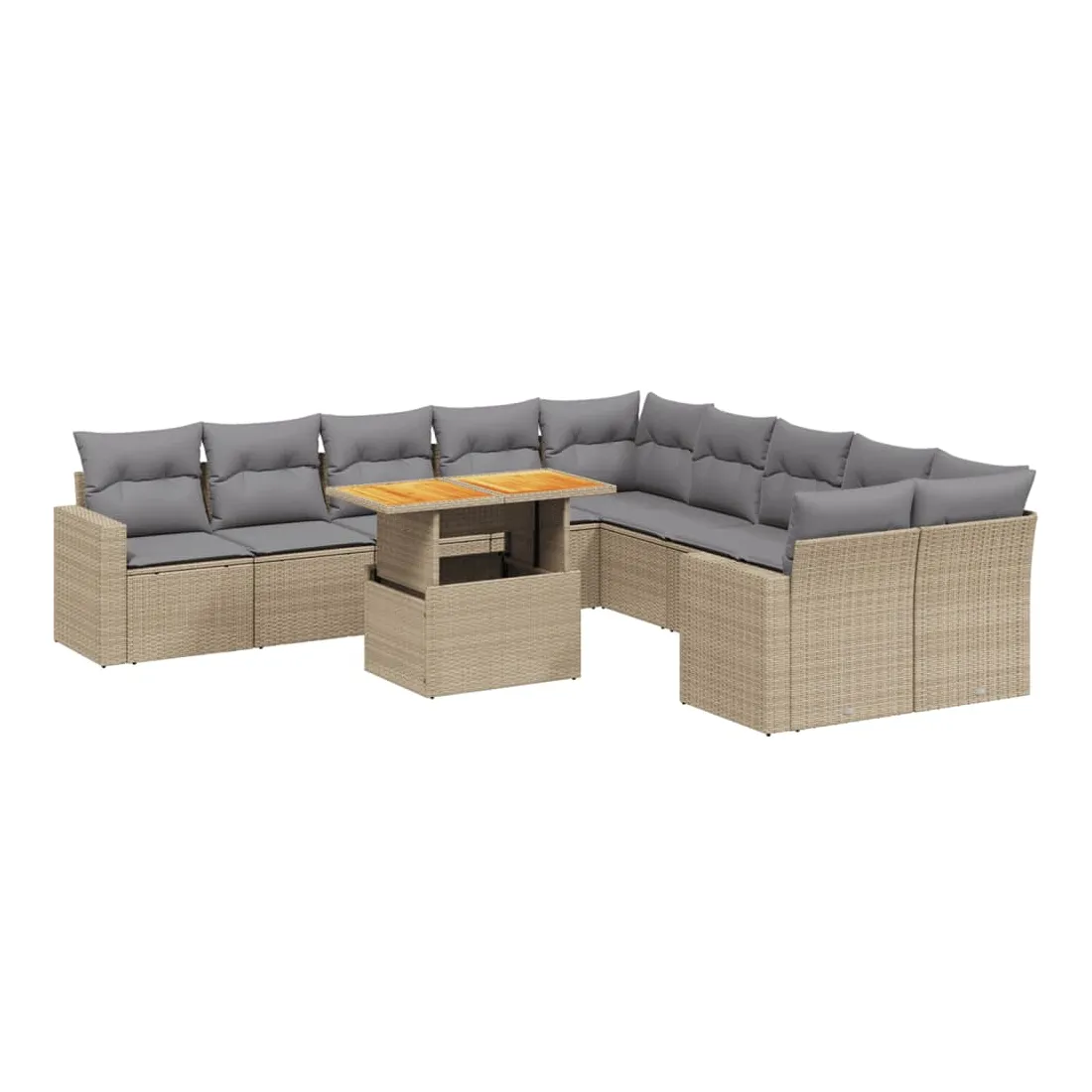 Cet ensemble de canapés de jardin est le complément parfait de votre arrière-cour, terrasse ou patio, offrant un espace confortable et accueillant pour discuter avec la famille et les amis ou simplement se détendre et profiter de l'extérieur. Matériau durable : la résine tressée, également connue sous le nom de poly rotin, est un matériau synthétique solide et nécessitant peu d'entretien qui ressemble au rotin naturel. Il est léger, facile à nettoyer et couramment utilisé pour les meubles d'extérieur en raison de sa durabilité et de ses propriétés de résistance aux intempéries.Dessus de table réglable : le dessus de table peut être soulevé pour rendre la table plus haute, ce qui transforme la table d'extérieur d'une table basse à une table de salle à manger. Elle est parfaite pour recevoir des invités ou prendre des repas à l'extérieur.Expérience d'assise confortable : ce mobilier d'extérieur, doté de coussins épais, offre une expérience d'assise confortable.Housse amovible et lavable : ces coussins de siège sont dotés de housses amovibles pour un lavage et un entretien faciles.Conception modulaire : cet ensemble de meubles d'extérieur a une conception modulaire, ce qui le rend complètement flexible et facile à déplacer, afin que vous puissiez créer un agencement de meubles d'extérieur personnalisé. Bon à savoir :Pour que vos meubles d'extérieur restent beaux, nous vous recommandons de les protéger avec une housse imperméable.