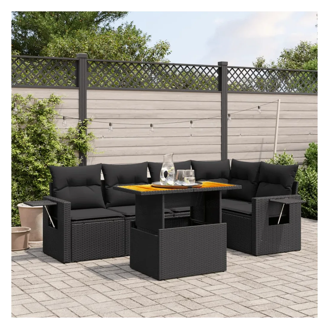 Cet ensemble de canapés de jardin est le complément parfait de votre arrière-cour, terrasse ou patio, offrant un espace confortable et accueillant pour discuter avec la famille et les amis ou simplement se détendre et profiter de l'extérieur. Matériau durable : la résine tressée, également connue sous le nom de poly rotin, est un matériau synthétique solide et nécessitant peu d'entretien qui ressemble au rotin naturel. Il est léger, facile à nettoyer et couramment utilisé pour les meubles d'extérieur en raison de sa durabilité et de ses propriétés de résistance aux intempéries.Dessus de table réglable : le dessus de table peut être soulevé pour rendre la table plus haute, ce qui transforme la table d'extérieur d'une table basse à une table de salle à manger. Elle est parfaite pour recevoir des invités ou prendre des repas à l'extérieur.Table d'appoint pratique : ce mobilier d'extérieur comprend une table d'appoint pliable avec un ressort à gaz sur les accoudoirs, offrant un endroit pratique pour garder vos essentiels à portée de main.Housse amovible et lavable : ces coussins de siège sont dotés de housses amovibles pour un lavage et un entretien faciles.Conception modulaire : cet ensemble de meubles d'extérieur a une conception modulaire, ce qui le rend complètement flexible et facile à déplacer, afin que vous puissiez créer un agencement de meubles d'extérieur personnalisé. Bon à savoir :Pour que vos meubles d'extérieur restent beaux, nous vous recommandons de les protéger avec une housse imperméable.