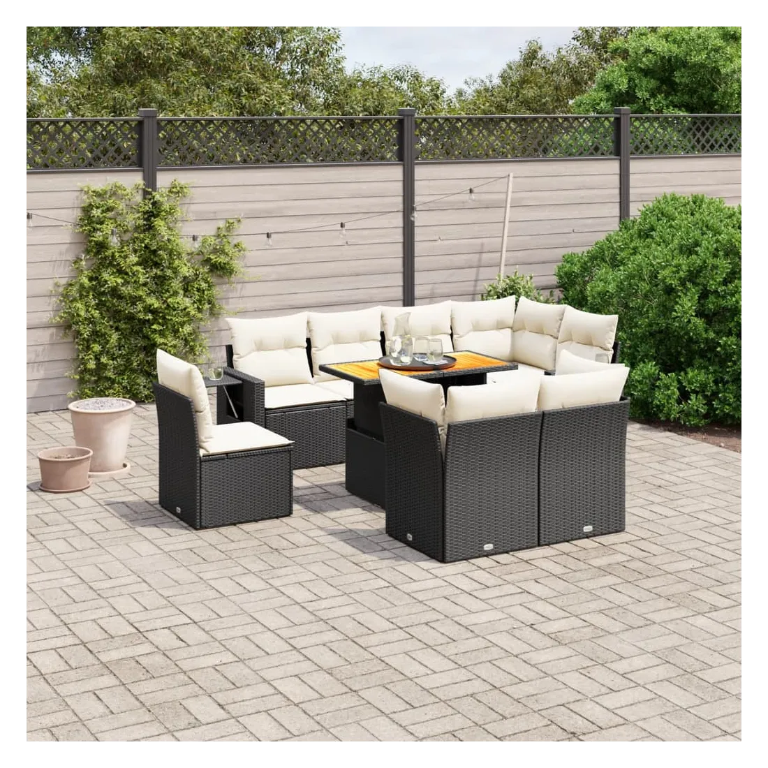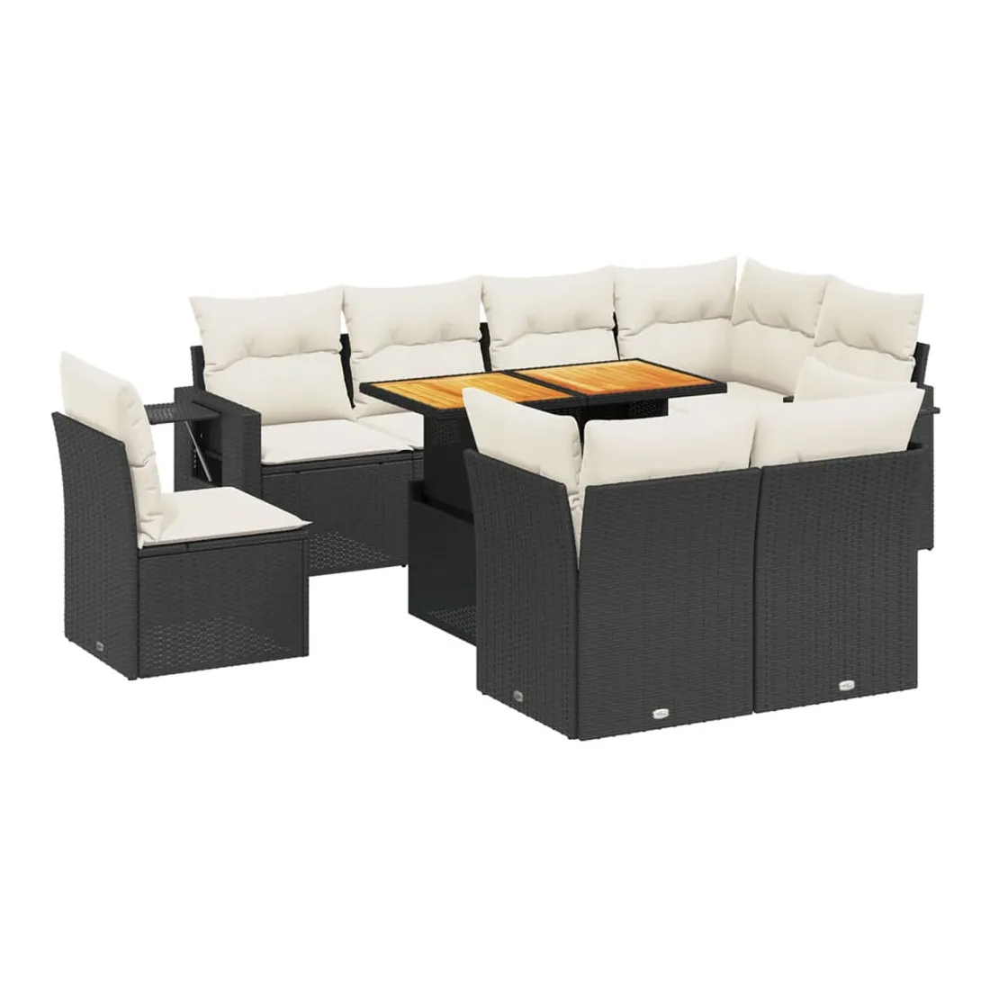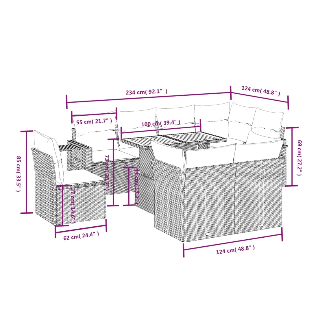 Cet ensemble de canapés de jardin est le complément parfait de votre arrière-cour, terrasse ou patio, offrant un espace confortable et accueillant pour discuter avec la famille et les amis ou simplement se détendre et profiter de l'extérieur. Matériau durable : la résine tressée, également connue sous le nom de poly rotin, est un matériau synthétique solide et nécessitant peu d'entretien qui ressemble au rotin naturel. Il est léger, facile à nettoyer et couramment utilisé pour les meubles d'extérieur en raison de sa durabilité et de ses propriétés de résistance aux intempéries.Dessus de table réglable : le dessus de table peut être soulevé pour rendre la table plus haute, ce qui transforme la table d'extérieur d'une table basse à une table de salle à manger. Elle est parfaite pour recevoir des invités ou prendre des repas à l'extérieur.Table d'appoint pratique : ce mobilier d'extérieur comprend une table d'appoint pliable avec un ressort à gaz sur les accoudoirs, offrant un endroit pratique pour garder vos essentiels à portée de main.Housse amovible et lavable : ces coussins de siège sont dotés de housses amovibles pour un lavage et un entretien faciles.Conception modulaire : cet ensemble de meubles d'extérieur a une conception modulaire, ce qui le rend complètement flexible et facile à déplacer, afin que vous puissiez créer un agencement de meubles d'extérieur personnalisé. Bon à savoir :Pour que vos meubles d'extérieur restent beaux, nous vous recommandons de les protéger avec une housse imperméable.