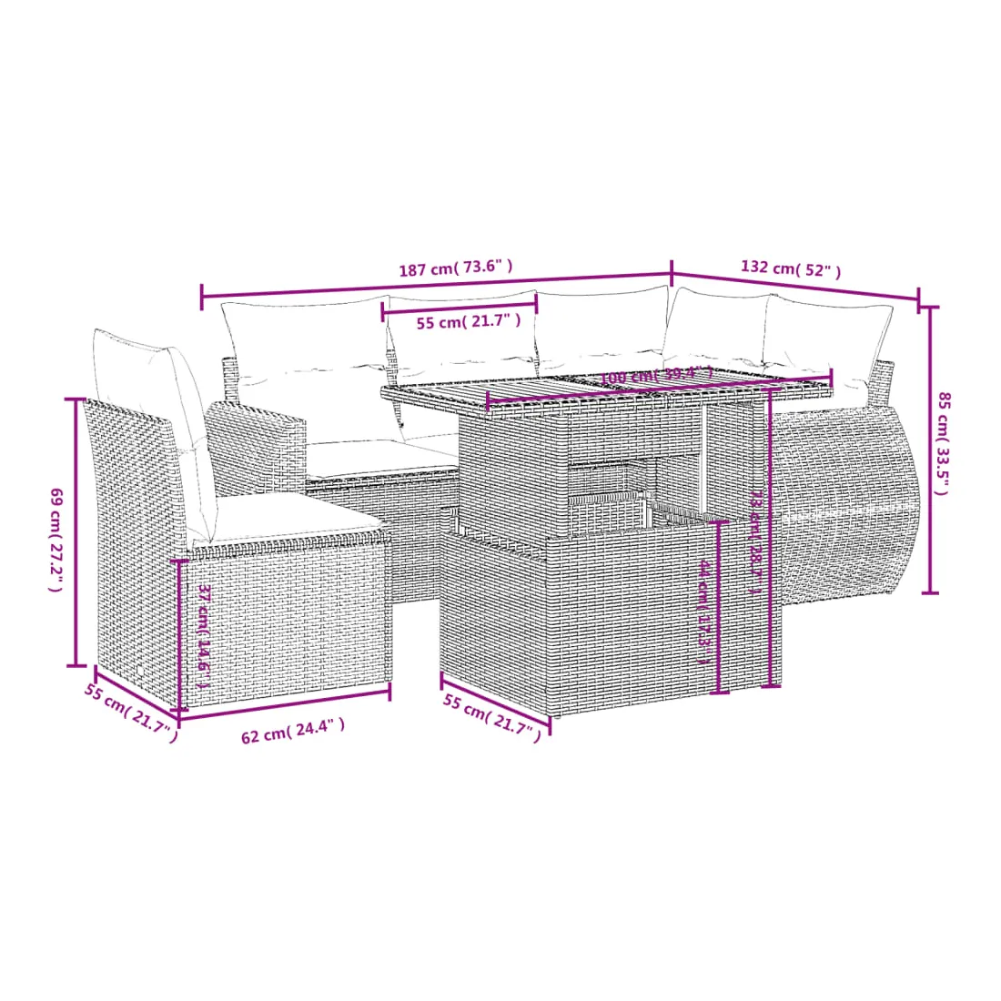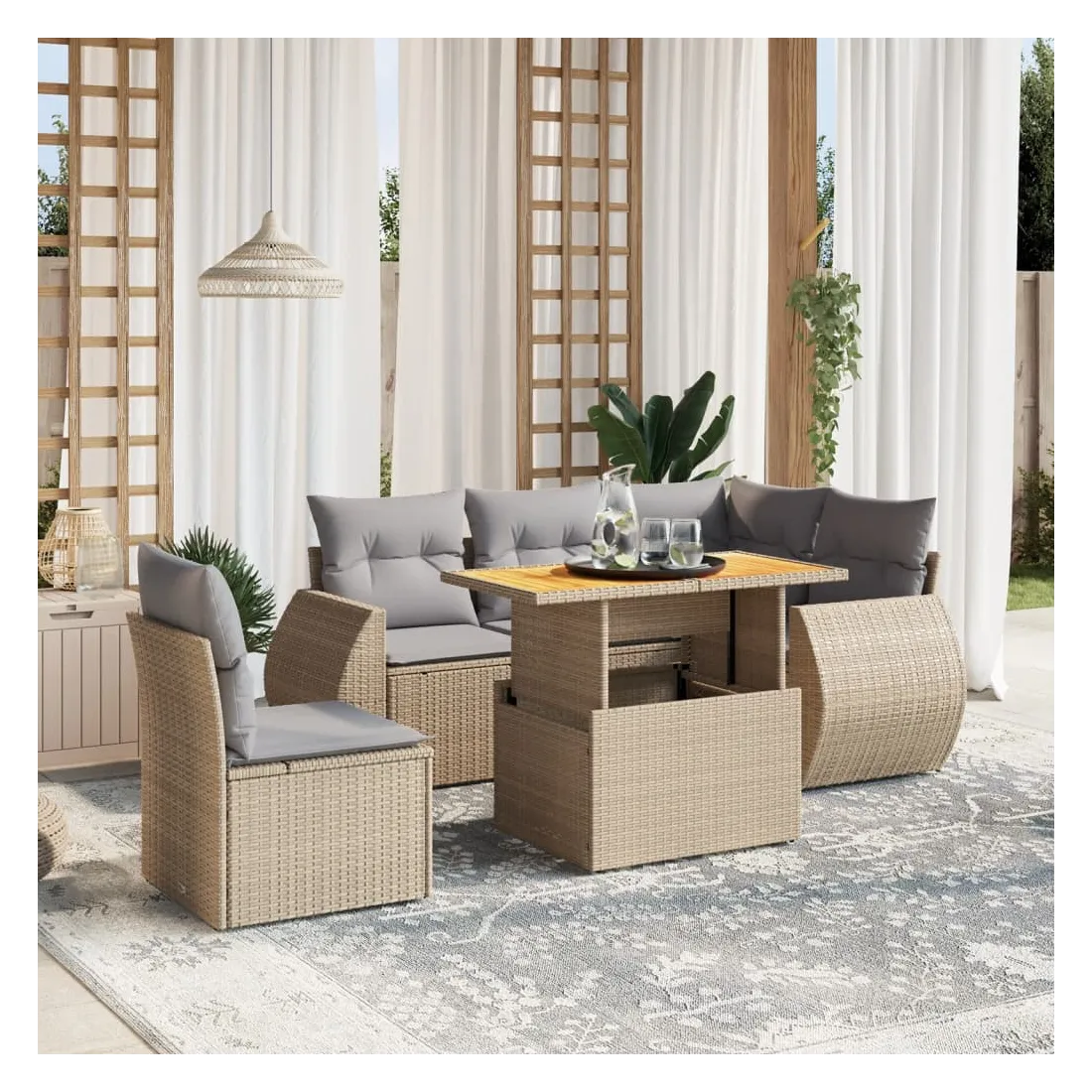 Cet ensemble de canapés de jardin est le complément parfait de votre arrière-cour, terrasse ou patio, offrant un espace confortable et accueillant pour discuter avec la famille et les amis ou simplement se détendre et profiter de l'extérieur. Matériau durable : la résine tressée, également connue sous le nom de poly rotin, est un matériau synthétique solide et nécessitant peu d'entretien qui ressemble au rotin naturel. Il est léger, facile à nettoyer et couramment utilisé pour les meubles d'extérieur en raison de sa durabilité et de ses propriétés de résistance aux intempéries.Dessus de table réglable : le dessus de table peut être soulevé pour rendre la table plus haute, ce qui transforme la table d'extérieur d'une table basse à une table de salle à manger. Elle est parfaite pour recevoir des invités ou prendre des repas à l'extérieur.Expérience d'assise confortable : ce mobilier d'extérieur, doté de coussins épais, offre une expérience d'assise confortable.Housse amovible et lavable : ces coussins de siège sont dotés de housses amovibles pour un lavage et un entretien faciles.Conception modulaire : cet ensemble de meubles d'extérieur a une conception modulaire, ce qui le rend complètement flexible et facile à déplacer, afin que vous puissiez créer un agencement de meubles d'extérieur personnalisé. Bon à savoir :Pour que vos meubles d'extérieur restent beaux, nous vous recommandons de les protéger avec une housse imperméable.