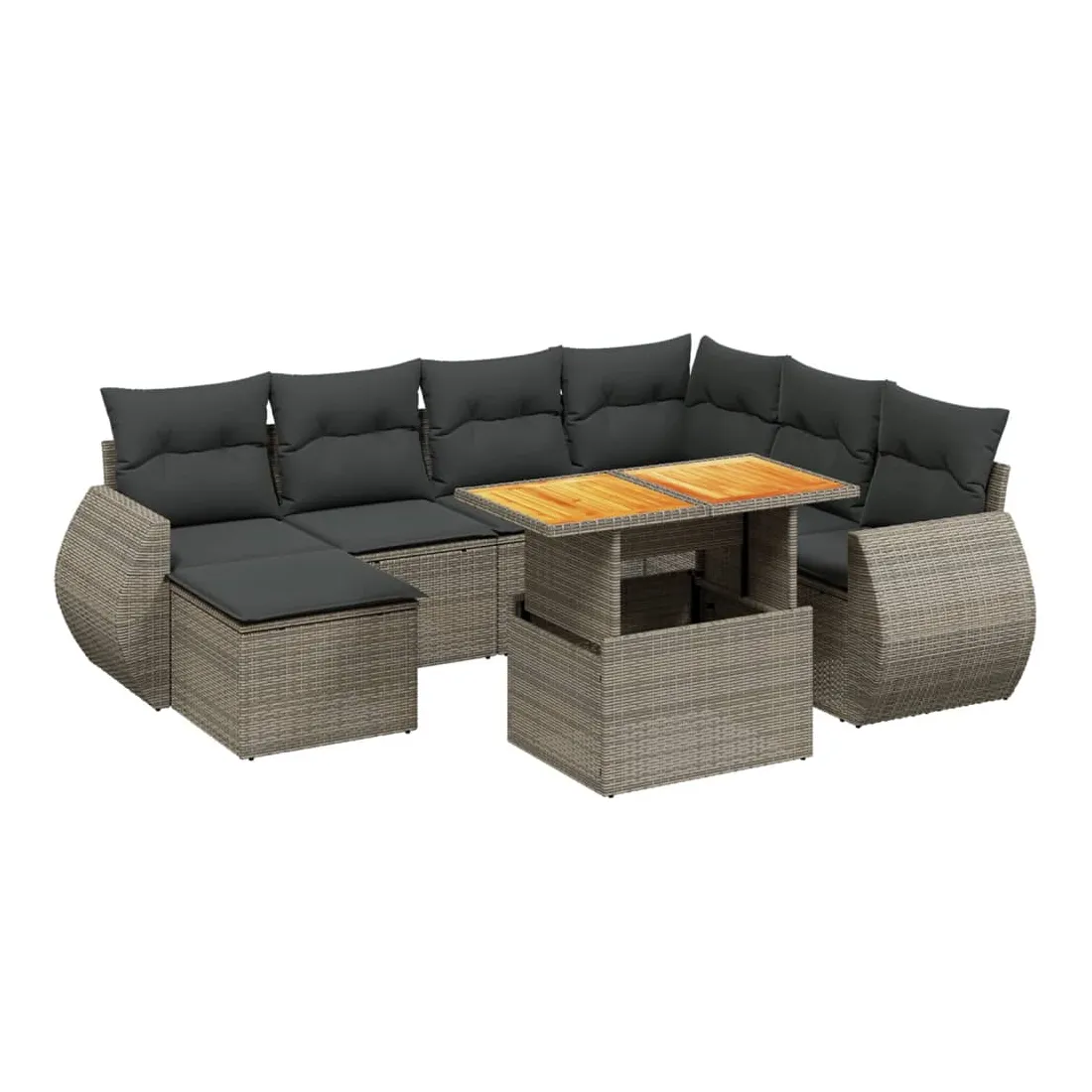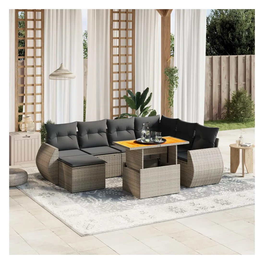 Cet ensemble de canapés de jardin est le complément parfait de votre arrière-cour, terrasse ou patio, offrant un espace confortable et accueillant pour discuter avec la famille et les amis ou simplement se détendre et profiter de l'extérieur. Matériau durable : la résine tressée, également connue sous le nom de poly rotin, est un matériau synthétique solide et nécessitant peu d'entretien qui ressemble au rotin naturel. Il est léger, facile à nettoyer et couramment utilisé pour les meubles d'extérieur en raison de sa durabilité et de ses propriétés de résistance aux intempéries.Dessus de table réglable : le dessus de table peut être soulevé pour rendre la table plus haute, ce qui transforme la table d'extérieur d'une table basse à une table de salle à manger. Elle est parfaite pour recevoir des invités ou prendre des repas à l'extérieur.Expérience d'assise confortable : ce mobilier d'extérieur, doté de coussins épais, offre une expérience d'assise confortable.Housse amovible et lavable : ces coussins de siège sont dotés de housses amovibles pour un lavage et un entretien faciles.Conception modulaire : cet ensemble de meubles d'extérieur a une conception modulaire, ce qui le rend complètement flexible et facile à déplacer, afin que vous puissiez créer un agencement de meubles d'extérieur personnalisé. Bon à savoir :Pour que vos meubles d'extérieur restent beaux, nous vous recommandons de les protéger avec une housse imperméable.