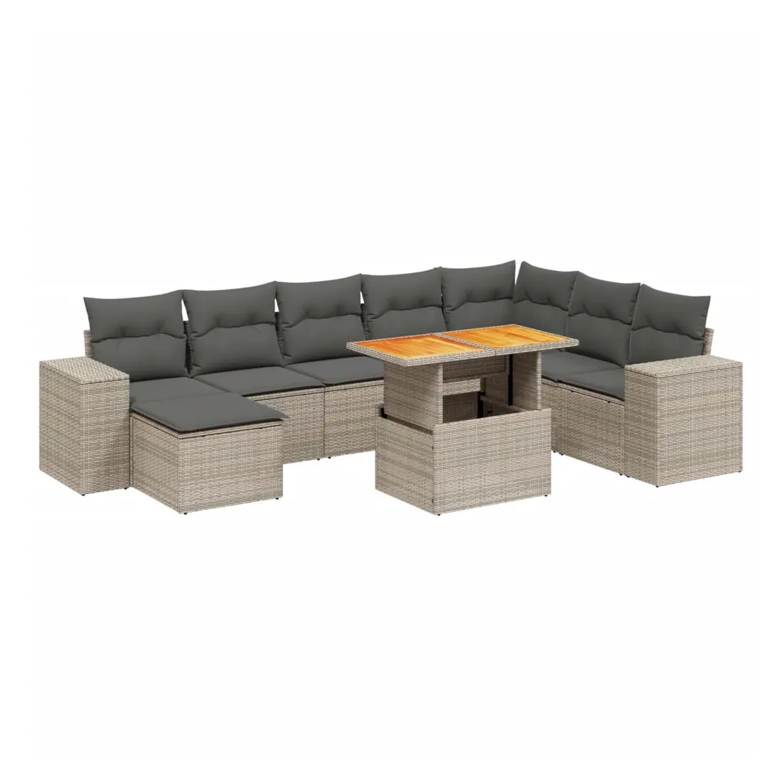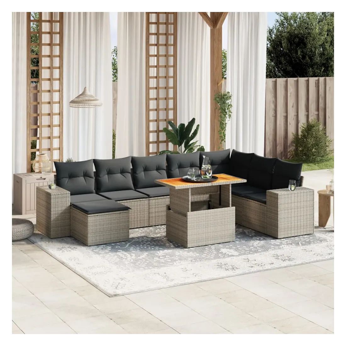 Cet ensemble de canapés de jardin est le complément parfait de votre arrière-cour, terrasse ou patio, offrant un espace confortable et accueillant pour discuter avec la famille et les amis ou simplement se détendre et profiter de l'extérieur. Matériau durable : la résine tressée, également connue sous le nom de poly rotin, est un matériau synthétique solide et nécessitant peu d'entretien qui ressemble au rotin naturel. Il est léger, facile à nettoyer et couramment utilisé pour les meubles d'extérieur en raison de sa durabilité et de ses propriétés de résistance aux intempéries.Dessus de table réglable : le dessus de table peut être soulevé pour rendre la table plus haute, ce qui transforme la table d'extérieur d'une table basse à une table de salle à manger. Elle est parfaite pour recevoir des invités ou prendre des repas à l'extérieur.Expérience d'assise confortable : ce mobilier d'extérieur, doté de coussins épais, offre une expérience d'assise confortable.Housse amovible et lavable : ces coussins de siège sont dotés de housses amovibles pour un lavage et un entretien faciles.Conception modulaire : cet ensemble de meubles d'extérieur a une conception modulaire, ce qui le rend complètement flexible et facile à déplacer, afin que vous puissiez créer un agencement de meubles d'extérieur personnalisé. Bon à savoir :Pour que vos meubles d'extérieur restent beaux, nous vous recommandons de les protéger avec une housse imperméable.