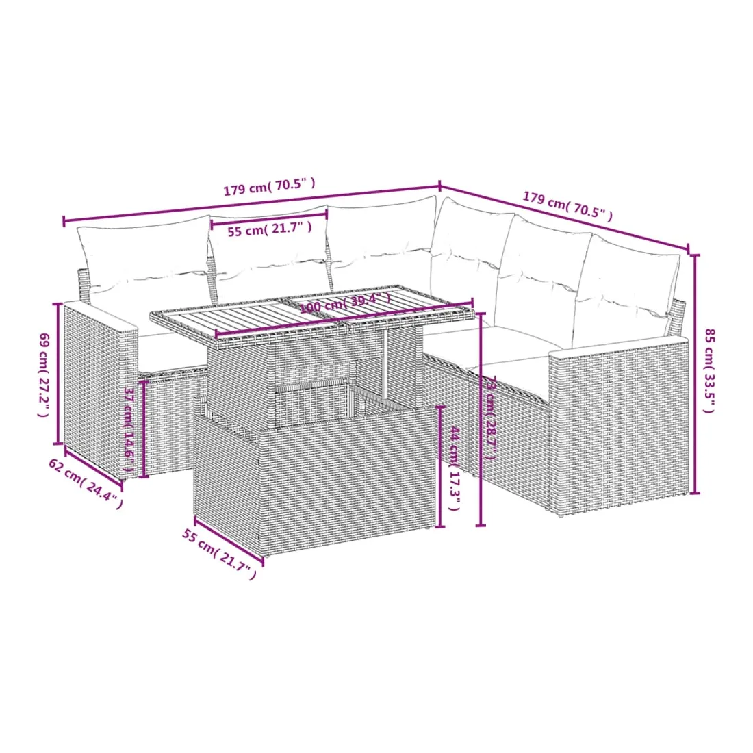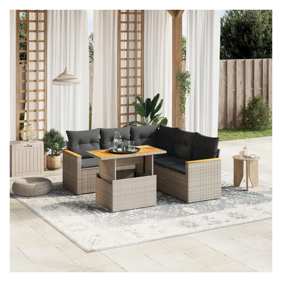Cet ensemble de canapés de jardin est le complément parfait de votre arrière-cour, terrasse ou patio, offrant un espace confortable et accueillant pour discuter avec la famille et les amis ou simplement se détendre et profiter de l'extérieur. Matériau durable : la résine tressée, également connue sous le nom de poly rotin, est un matériau synthétique solide et nécessitant peu d'entretien qui ressemble au rotin naturel. Il est léger, facile à nettoyer et couramment utilisé pour les meubles d'extérieur en raison de sa durabilité et de ses propriétés de résistance aux intempéries.Dessus de table réglable : le dessus de table peut être soulevé pour rendre la table plus haute, ce qui transforme la table d'extérieur d'une table basse à une table de salle à manger. Elle est parfaite pour recevoir des invités ou prendre des repas à l'extérieur.Expérience d'assise confortable : ce mobilier d'extérieur, doté de coussins épais, offre une expérience d'assise confortable.Housse amovible et lavable : ces coussins de siège sont dotés de housses amovibles pour un lavage et un entretien faciles.Conception modulaire : cet ensemble de meubles d'extérieur a une conception modulaire, ce qui le rend complètement flexible et facile à déplacer, afin que vous puissiez créer un agencement de meubles d'extérieur personnalisé. Bon à savoir :Pour que vos meubles d'extérieur restent beaux, nous vous recommandons de les protéger avec une housse imperméable.
