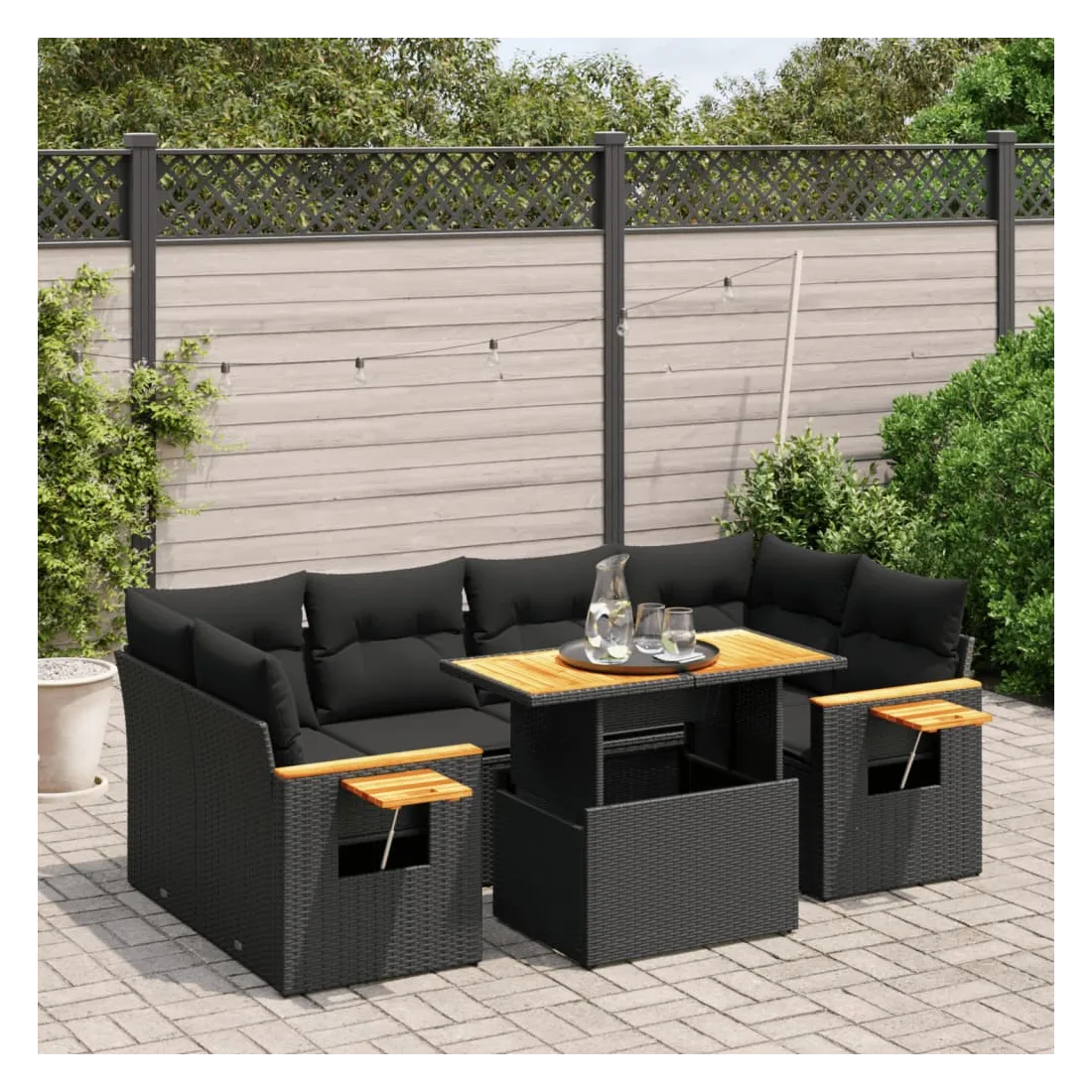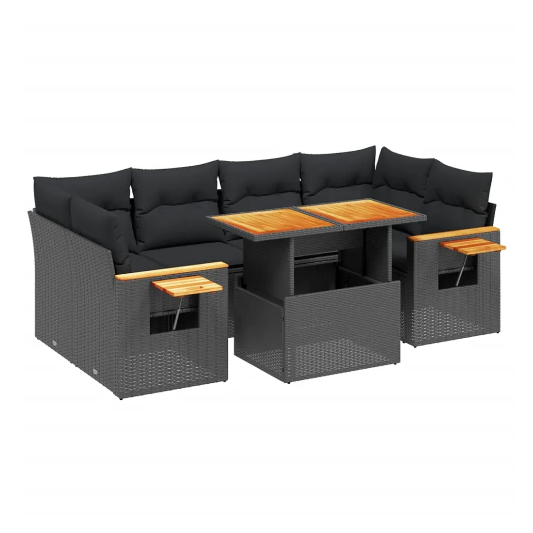 Cet ensemble de canapés de jardin est le complément parfait de votre arrière-cour, terrasse ou patio, offrant un espace confortable et accueillant pour discuter avec la famille et les amis ou simplement se détendre et profiter de l'extérieur. Matériau durable : la résine tressée, également connue sous le nom de poly rotin, est un matériau synthétique solide et nécessitant peu d'entretien qui ressemble au rotin naturel. Il est léger, facile à nettoyer et couramment utilisé pour les meubles d'extérieur en raison de sa durabilité et de ses propriétés de résistance aux intempéries.Dessus de table réglable : le dessus de table peut être soulevé pour rendre la table plus haute, ce qui transforme la table d'extérieur d'une table basse à une table de salle à manger. Elle est parfaite pour recevoir des invités ou prendre des repas à l'extérieur.Table d'appoint pratique : ce mobilier d'extérieur comprend une table d'appoint pliable avec un ressort à gaz sur les accoudoirs, offrant un endroit pratique pour garder vos essentiels à portée de main.Housse amovible et lavable : ces coussins de siège sont dotés de housses amovibles pour un lavage et un entretien faciles.Conception modulaire : cet ensemble de meubles d'extérieur a une conception modulaire, ce qui le rend complètement flexible et facile à déplacer, afin que vous puissiez créer un agencement de meubles d'extérieur personnalisé. Bon à savoir :Pour que vos meubles d'extérieur restent beaux, nous vous recommandons de les protéger avec une housse imperméable.