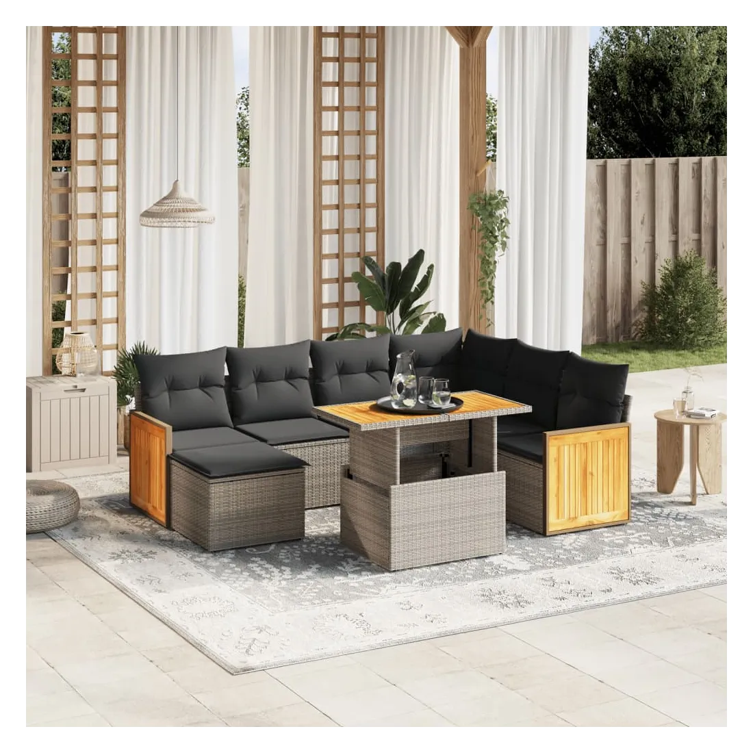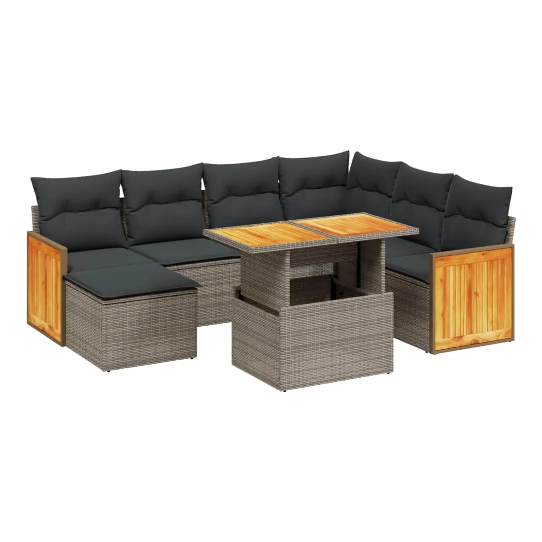 Cet ensemble de canapés de jardin est le complément parfait de votre arrière-cour, terrasse ou patio, offrant un espace confortable et accueillant pour discuter avec la famille et les amis ou simplement se détendre et profiter de l'extérieur. Matériau durable : la résine tressée, également connue sous le nom de poly rotin, est un matériau synthétique solide et nécessitant peu d'entretien qui ressemble au rotin naturel. Il est léger, facile à nettoyer et couramment utilisé pour les meubles d'extérieur en raison de sa durabilité et de ses propriétés de résistance aux intempéries.Dessus de table réglable : le dessus de table peut être soulevé pour rendre la table plus haute, ce qui transforme la table d'extérieur d'une table basse à une table de salle à manger. Elle est parfaite pour recevoir des invités ou prendre des repas à l'extérieur.Housse amovible et lavable : ces coussins de siège sont dotés de housses amovibles pour un lavage et un entretien faciles.Conception modulaire : cet ensemble de meubles d'extérieur a une conception modulaire, ce qui le rend complètement flexible et facile à déplacer, afin que vous puissiez créer un agencement de meubles d'extérieur personnalisé. Bon à savoir :Pour que vos meubles d'extérieur restent beaux, nous vous recommandons de les protéger avec une housse imperméable.