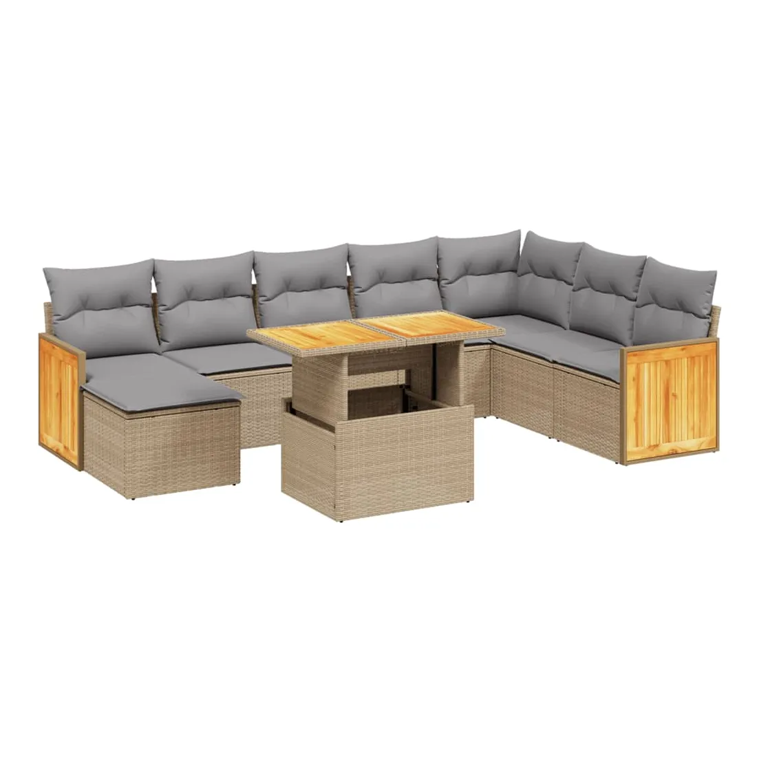 Cet ensemble de canapés de jardin est le complément parfait de votre arrière-cour, terrasse ou patio, offrant un espace confortable et accueillant pour discuter avec la famille et les amis ou simplement se détendre et profiter de l'extérieur. Matériau durable : la résine tressée, également connue sous le nom de poly rotin, est un matériau synthétique solide et nécessitant peu d'entretien qui ressemble au rotin naturel. Il est léger, facile à nettoyer et couramment utilisé pour les meubles d'extérieur en raison de sa durabilité et de ses propriétés de résistance aux intempéries.Dessus de table réglable : le dessus de table peut être soulevé pour rendre la table plus haute, ce qui transforme la table d'extérieur d'une table basse à une table de salle à manger. Elle est parfaite pour recevoir des invités ou prendre des repas à l'extérieur.Housse amovible et lavable : ces coussins de siège sont dotés de housses amovibles pour un lavage et un entretien faciles.Conception modulaire : cet ensemble de meubles d'extérieur a une conception modulaire, ce qui le rend complètement flexible et facile à déplacer, afin que vous puissiez créer un agencement de meubles d'extérieur personnalisé. Bon à savoir :Pour que vos meubles d'extérieur restent beaux, nous vous recommandons de les protéger avec une housse imperméable.