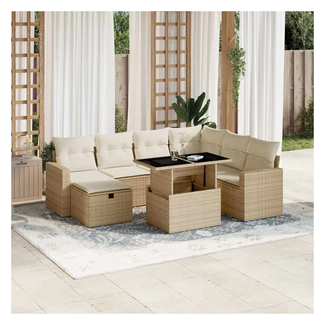 Cet ensemble de canapés de jardin est le complément parfait de votre arrière-cour, terrasse ou patio, offrant un espace confortable et accueillant pour discuter avec la famille et les amis ou simplement se détendre et profiter de l'extérieur. Matériau durable : la résine tressée, également connue sous le nom de poly rotin, est un matériau synthétique solide et nécessitant peu d'entretien qui ressemble au rotin naturel. Il est léger, facile à nettoyer et couramment utilisé pour les meubles d'extérieur en raison de sa durabilité et de ses propriétés de résistance aux intempéries.Dessus de table réglable : le dessus de table peut être soulevé pour rendre la table plus haute, ce qui transforme la table d'extérieur d'une table basse à une table de salle à manger. Elle est parfaite pour recevoir des invités ou prendre des repas à l'extérieur.Housse amovible et lavable : ces coussins de siège sont dotés de housses amovibles pour un lavage et un entretien faciles.Conception modulaire : cet ensemble de meubles d'extérieur a une conception modulaire, ce qui le rend complètement flexible et facile à déplacer, afin que vous puissiez créer un agencement de meubles d'extérieur personnalisé. Bon à savoir :Pour que vos meubles d'extérieur restent beaux, nous vous recommandons de les protéger avec une housse imperméable.