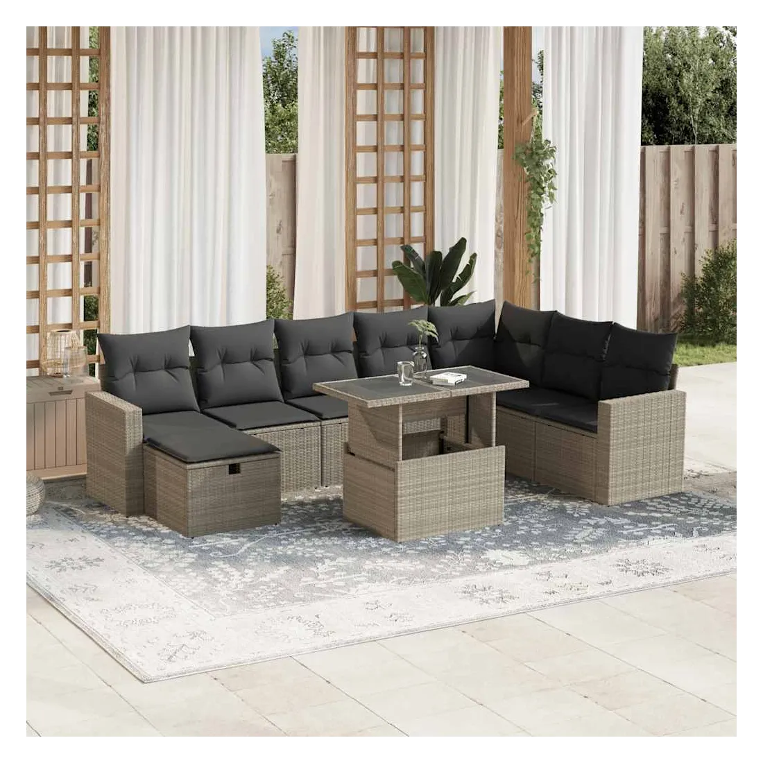 Cet ensemble de canapés de jardin est le complément parfait de votre arrière-cour, terrasse ou patio, offrant un espace confortable et accueillant pour discuter avec la famille et les amis ou simplement se détendre et profiter de l'extérieur. Matériau durable : la résine tressée, également connue sous le nom de poly rotin, est un matériau synthétique solide et nécessitant peu d'entretien qui ressemble au rotin naturel. Elle est légère, facile à nettoyer et couramment utilisée pour les meubles d'extérieur en raison de sa durabilité et de ses propriétés de résistance aux intempéries.Dessus de table réglable : le dessus de table peut être soulevé pour rendre la table plus haute, ce qui transforme la table d'extérieur d'une table basse à une table de salle à manger. Elle est parfaite pour recevoir des invités ou prendre des repas à l'extérieur.Housse amovible et lavable : ces coussins de siège sont dotés de housses amovibles pour un lavage et un entretien faciles.Conception modulaire : cet ensemble de meubles d'extérieur a une conception modulaire, ce qui le rend complètement flexible et facile à déplacer, afin que vous puissiez créer un agencement de meubles d'extérieur personnalisé. Bon à savoir :Pour que vos meubles d'extérieur restent beaux, nous vous recommandons de les protéger avec une housse imperméable.
