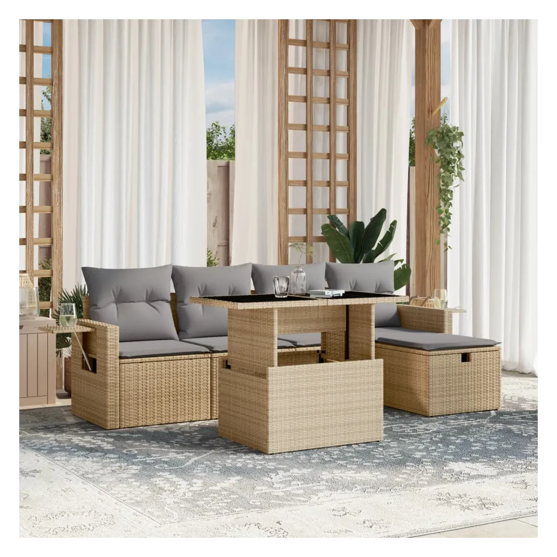 Cet ensemble de canapés de jardin est le complément parfait de votre arrière-cour, terrasse ou patio, offrant un espace confortable et accueillant pour discuter avec la famille et les amis ou simplement se détendre et profiter de l'extérieur. Matériau durable : la résine tressée, également connue sous le nom de poly rotin, est un matériau synthétique solide et nécessitant peu d'entretien qui ressemble au rotin naturel. Il est léger, facile à nettoyer et couramment utilisé pour les meubles d'extérieur en raison de sa durabilité et de ses propriétés de résistance aux intempéries.Dessus de table réglable : le dessus de table peut être soulevé pour rendre la table plus haute, ce qui transforme la table d'extérieur d'une table basse à une table de salle à manger. Elle est parfaite pour recevoir des invités ou prendre des repas à l'extérieur.Housse amovible et lavable : ces coussins de siège sont dotés de housses amovibles pour un lavage et un entretien faciles.Conception modulaire : cet ensemble de meubles d'extérieur a une conception modulaire, ce qui le rend complètement flexible et facile à déplacer, afin que vous puissiez créer un agencement de meubles d'extérieur personnalisé. Bon à savoir :Pour que vos meubles d'extérieur restent beaux, nous vous recommandons de les protéger avec une housse imperméable.