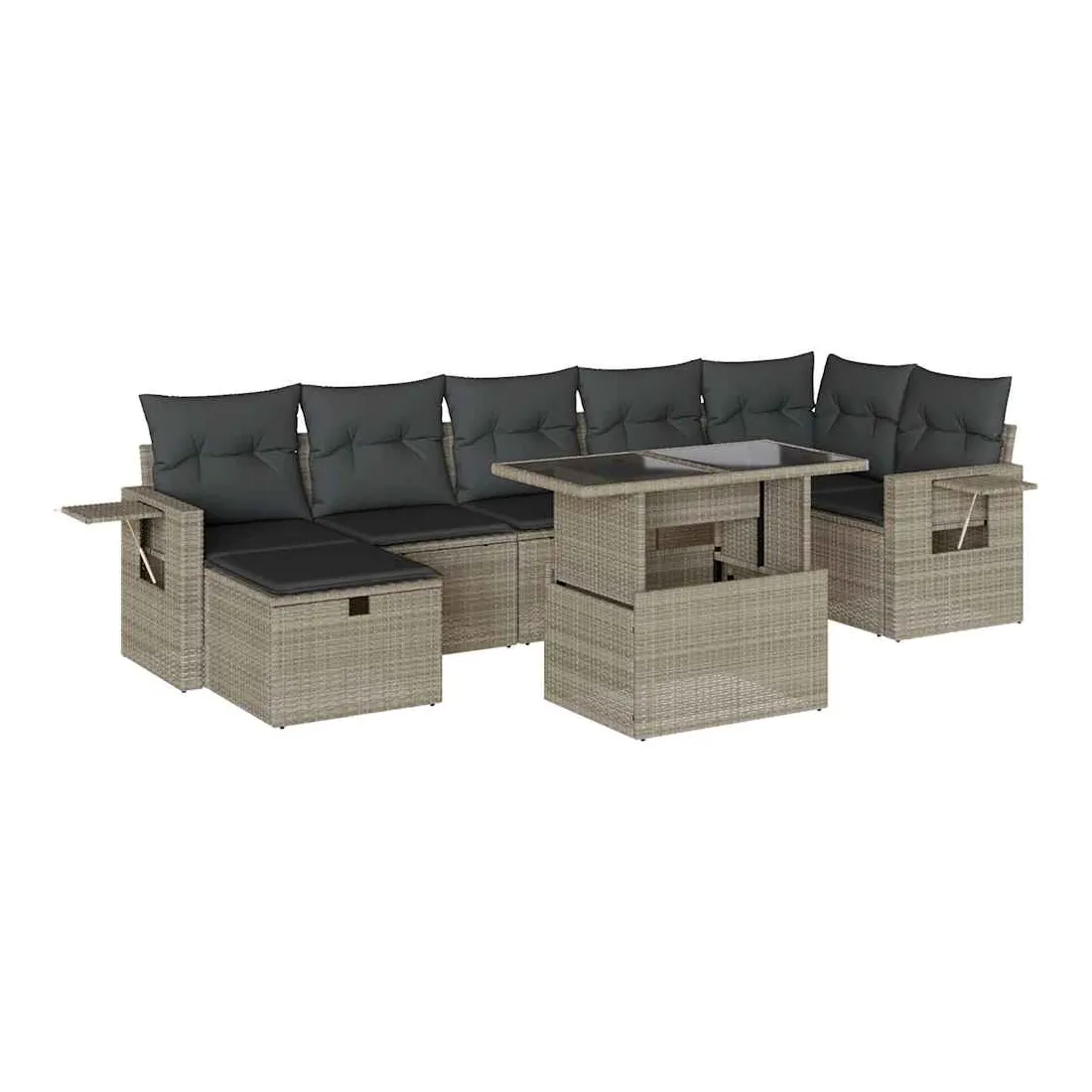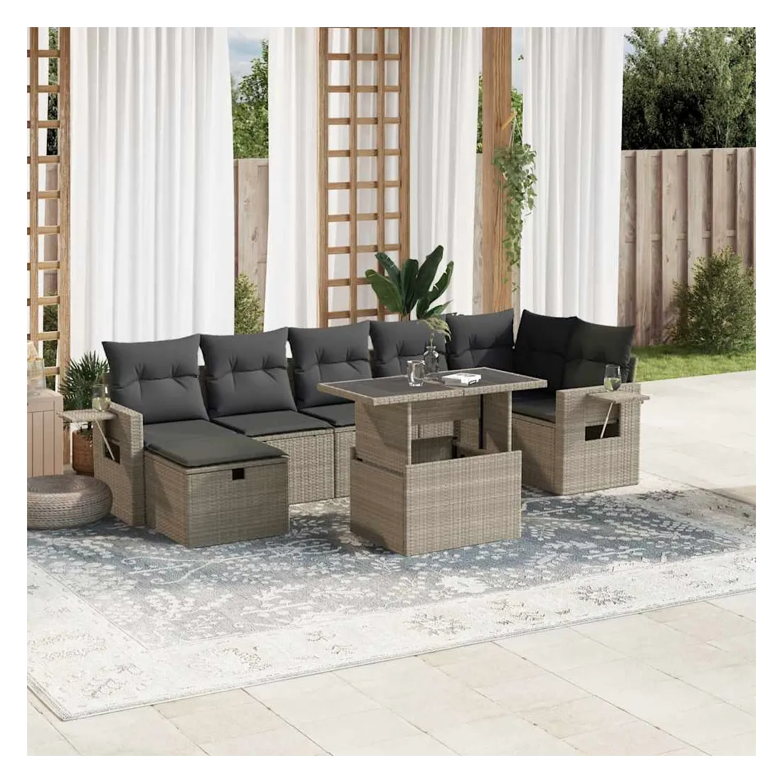 Cet ensemble de canapés de jardin est le complément parfait de votre arrière-cour, terrasse ou patio, offrant un espace confortable et accueillant pour discuter avec la famille et les amis ou simplement se détendre et profiter de l'extérieur. Matériau durable : la résine tressée, également connue sous le nom de poly rotin, est un matériau synthétique solide et nécessitant peu d'entretien qui ressemble au rotin naturel. Elle est légère, facile à nettoyer et couramment utilisée pour les meubles d'extérieur en raison de sa durabilité et de ses propriétés de résistance aux intempéries.Dessus de table réglable : le dessus de table peut être soulevé pour rendre la table plus haute, ce qui transforme la table d'extérieur d'une table basse à une table de salle à manger. Elle est parfaite pour recevoir des invités ou prendre des repas à l'extérieur.Housse amovible et lavable : ces coussins de siège sont dotés de housses amovibles pour un lavage et un entretien faciles.Conception modulaire : cet ensemble de meubles d'extérieur a une conception modulaire, ce qui le rend complètement flexible et facile à déplacer, afin que vous puissiez créer un agencement de meubles d'extérieur personnalisé. Bon à savoir :Pour que vos meubles d'extérieur restent beaux, nous vous recommandons de les protéger avec une housse imperméable.