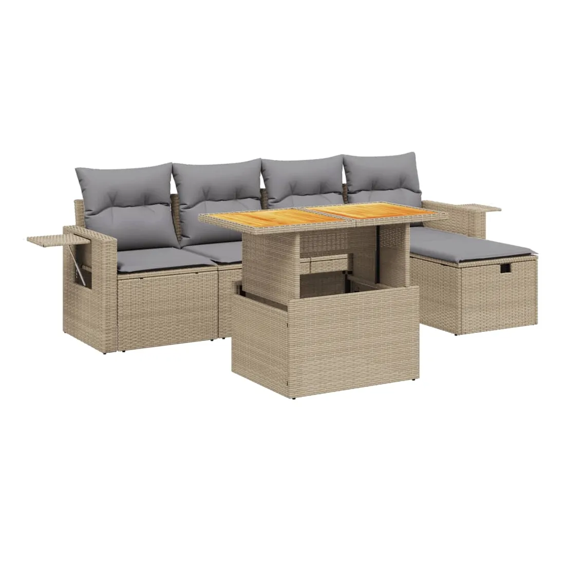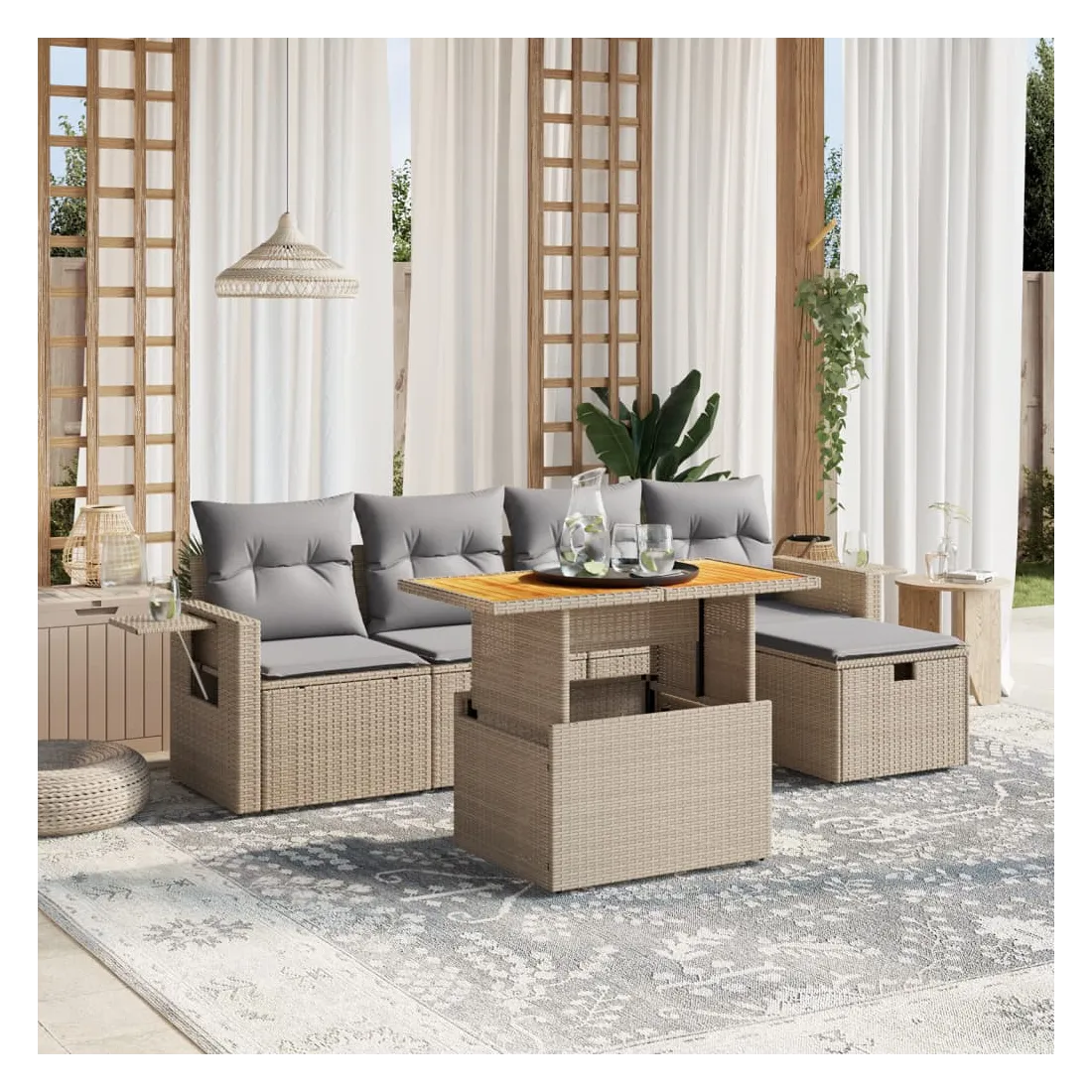 Cet ensemble de canapés de jardin est le complément parfait de votre arrière-cour, terrasse ou patio, offrant un espace confortable et accueillant pour discuter avec la famille et les amis ou simplement se détendre et profiter de l'extérieur. Matériau durable : la résine tressée, également connue sous le nom de poly rotin, est un matériau synthétique solide et nécessitant peu d'entretien qui ressemble au rotin naturel. Il est léger, facile à nettoyer et couramment utilisé pour les meubles d'extérieur en raison de sa durabilité et de ses propriétés de résistance aux intempéries.Dessus de table réglable : le dessus de table peut être soulevé pour rendre la table plus haute, ce qui transforme la table d'extérieur d'une table basse à une table de salle à manger. Elle est parfaite pour recevoir des invités ou prendre des repas à l'extérieur.Table d'appoint pratique : ce mobilier d'extérieur comprend une table d'appoint pliable avec un ressort à gaz sur les accoudoirs, offrant un endroit pratique pour garder vos essentiels à portée de main.Housse amovible et lavable : ces coussins de siège sont dotés de housses amovibles pour un lavage et un entretien faciles.Conception modulaire : cet ensemble de meubles d'extérieur a une conception modulaire, ce qui le rend complètement flexible et facile à déplacer, afin que vous puissiez créer un agencement de meubles d'extérieur personnalisé. Bon à savoir :Pour que vos meubles d'extérieur restent beaux, nous vous recommandons de les protéger avec une housse imperméable.