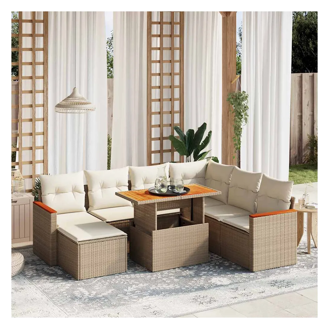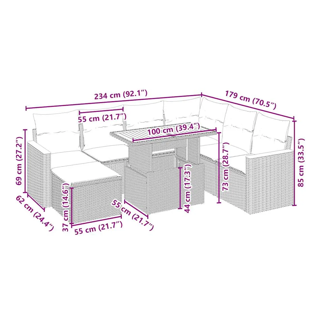 Cet ensemble de canapés de jardin est le complément parfait de votre arrière-cour, terrasse ou patio, offrant un espace confortable et accueillant pour discuter avec la famille et les amis ou simplement se détendre et profiter de l'extérieur. Matériau durable : la résine tressée, également connue sous le nom de poly rotin, est un matériau synthétique solide et nécessitant peu d'entretien qui ressemble au rotin naturel. Il est léger, facile à nettoyer et couramment utilisé pour les meubles d'extérieur en raison de sa durabilité et de ses propriétés de résistance aux intempéries.Dessus de table réglable : le dessus de table peut être soulevé pour rendre la table plus haute, ce qui transforme la table d'extérieur d'une table basse à une table de salle à manger. Elle est parfaite pour recevoir des invités ou prendre des repas à l'extérieur.Housse amovible et lavable : ces coussins de siège sont dotés de housses amovibles pour un lavage et un entretien faciles.Conception modulaire : cet ensemble de meubles d'extérieur a une conception modulaire, ce qui le rend complètement flexible et facile à déplacer, afin que vous puissiez créer un agencement de meubles d'extérieur personnalisé. Bon à savoir :Pour que vos meubles d'extérieur restent beaux, nous vous recommandons de les protéger avec une housse imperméable.