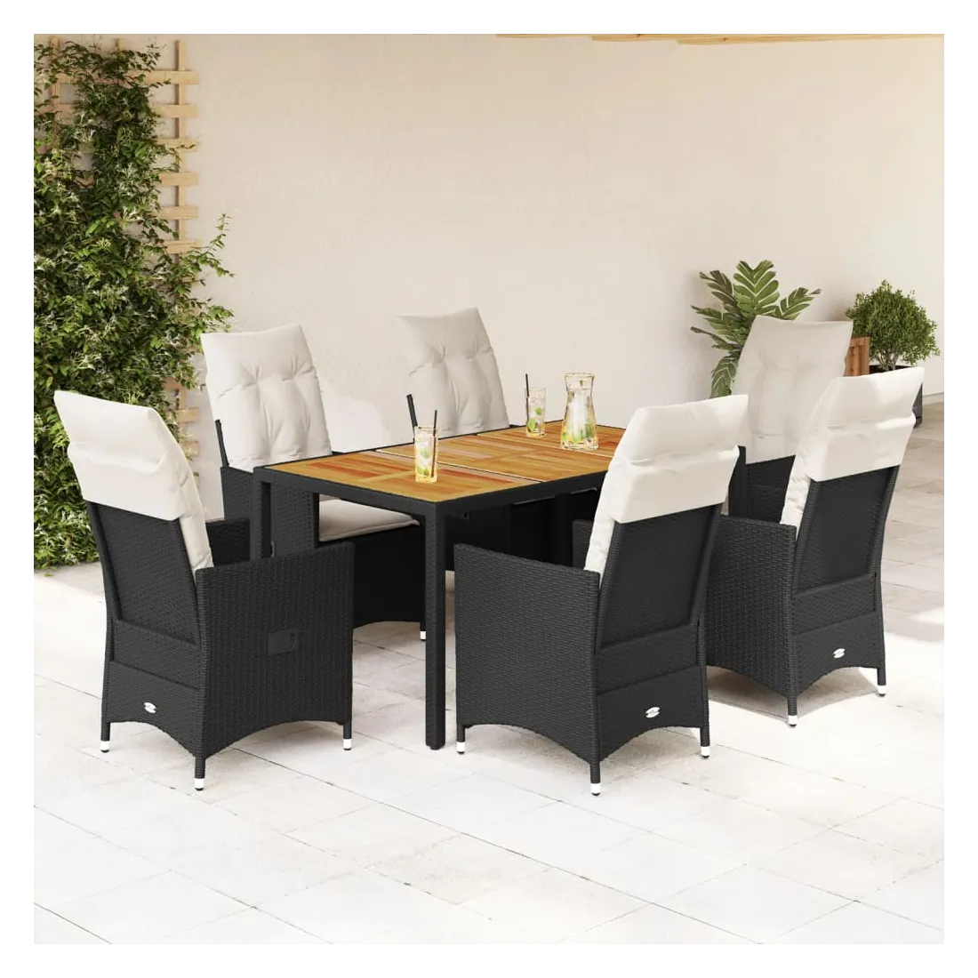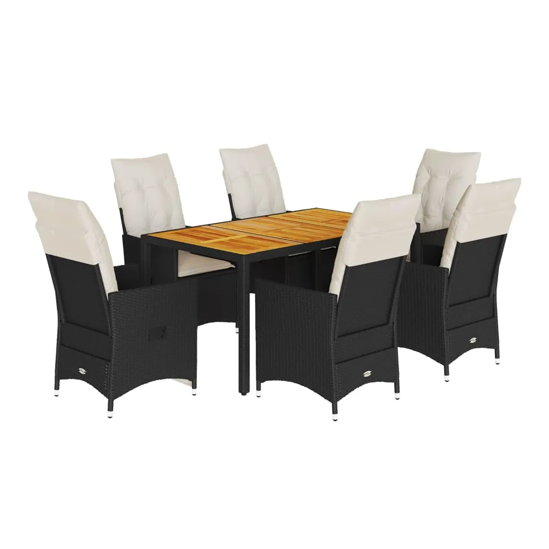 Cet ensemble de salle à manger de jardin est un excellent choix pour les repas en plein air ou simplement pour se détendre dans le jardin, la cour arrière ou sur la terrasse. Matériau durable : le rotin PE, également appelé polyrotin, est un matériau synthétique solide et facile d'entretien qui ressemble au rotin naturel. Il est léger, facile à nettoyer et couramment utilisé pour les meubles d'extérieur en raison de sa durabilité et de sa résistance aux intempéries. Dossier réglable : ce siège de jardin est équipé d'une poignée. Vous pouvez régler le dossier dans n'importe quelle position en tirant sur la poignée, puis le remettre rapidement dans sa position d'origine. Plateau stable et facile à nettoyer : cette table de jardin est dotée d'un plateau en bois d'acacia robuste, durable et facile à nettoyer avec un chiffon humide. Assise confortable : cet ensemble de mobilier d'extérieur, doté de coussins épais et rembourrés, offre une assise confortable. Housse amovible et lavable : ces coussins d'assise sont dotés de housses amovibles pour faciliter le lavage et l'entretien. Les coussins de dossier sont dotés d'un rabat à l'arrière pour faciliter leur fixation aux dossiers. Bon à savoir :Pour que votre mobilier d'extérieur reste beau, nous vous recommandons de le protéger avec une housse imperméable.
