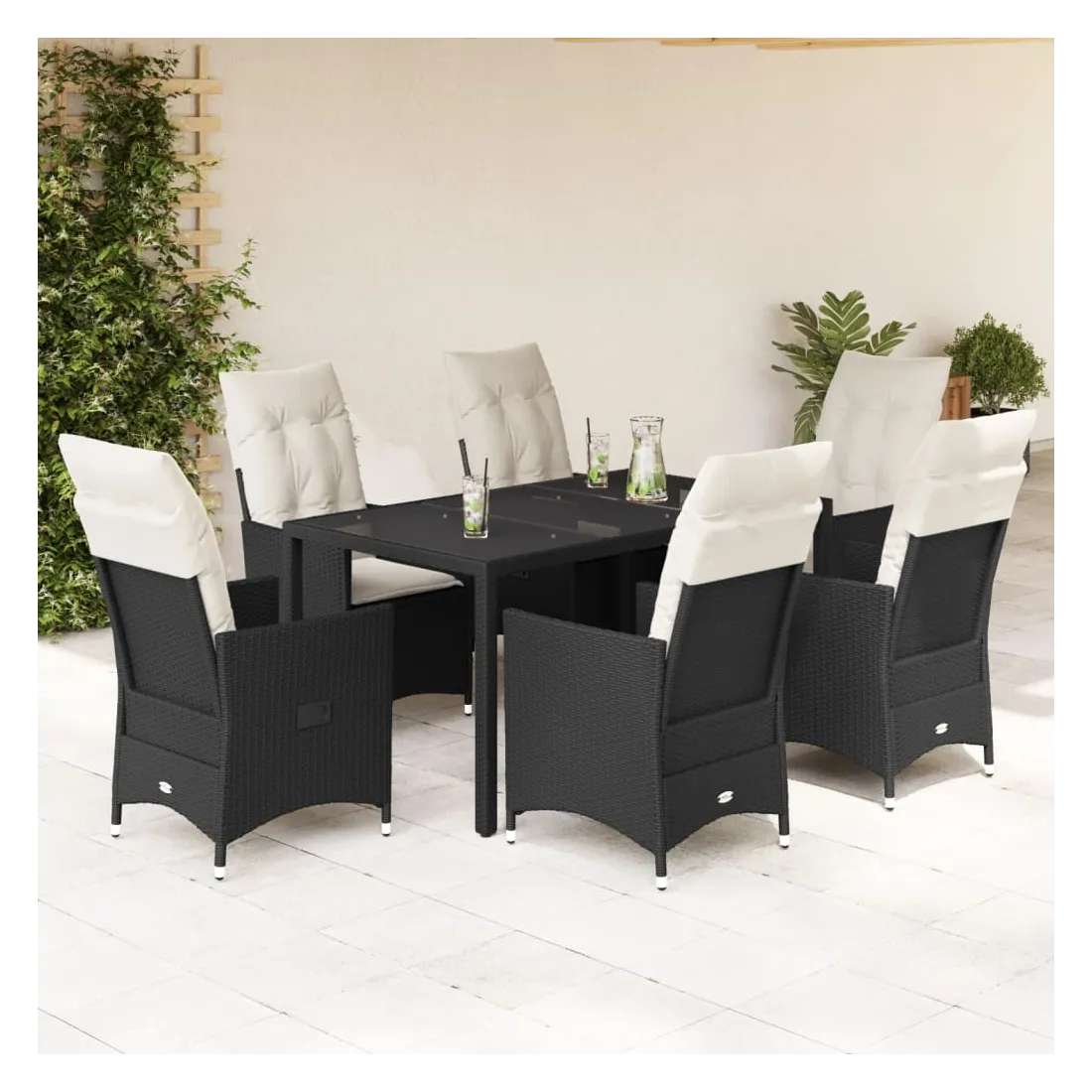 Cet ensemble de salle à manger de jardin est un excellent choix pour les repas en plein air ou pour vous détendre dans le jardin, dans l'arrière-cour ou sur la terrasse. Matériau durable : la résine tressée, également connue sous le nom de poly rotin, est un matériau synthétique solide et nécessitant peu d'entretien qui ressemble au rotin naturel. Il est léger, facile à nettoyer et couramment utilisé pour les meubles d'extérieur en raison de sa durabilité et de ses propriétés de résistance aux intempéries.Dossier réglable : ce siège de jardin est doté d'une poignée. Vous pouvez régler le dossier dans n'importe quelle position en tirant sur la poignée et le remettre rapidement dans sa position initiale.Dessus en verre : le dessus de la table d'extérieur est fabriqué en verre trempé solide et durable, ce qui le rend facile à nettoyer avec un chiffon humide et ajoute une touche d'élégance à votre espace extérieur.Expérience d'assise confortable : cet ensemble de meubles d'extérieur, doté de coussins épais, offre une expérience d'assise confortable.Housse amovible et lavable : ces coussins de siège sont dotés de housses amovibles pour un lavage et un entretien faciles. Les coussins de dossier ont un rabat à l'arrière pour une fixation facile aux dossiers. Bon à savoir :Pour que vos meubles d'extérieur restent beaux, nous vous recommandons de les protéger avec une housse imperméable.